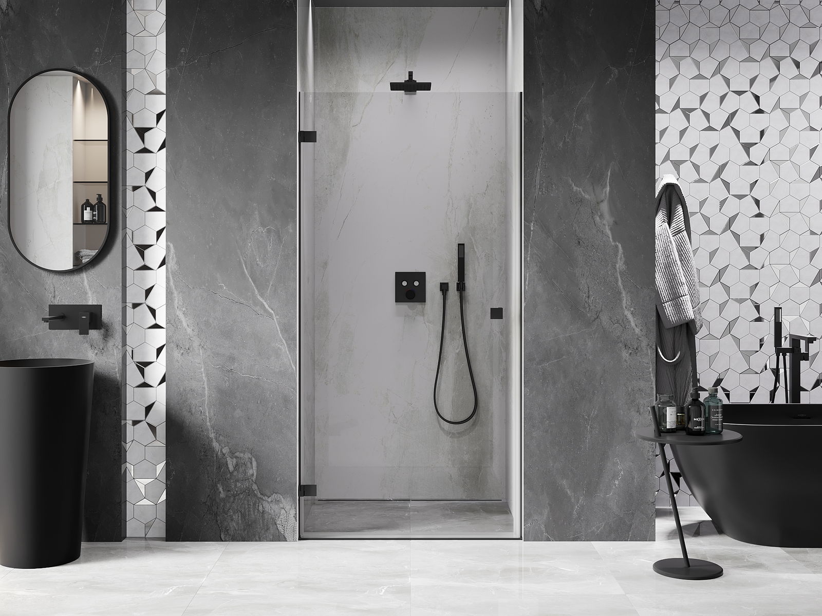 Praktická a pohodlná rukojeť je vyrobena z odolného a trvanlivého kovu. Moderní tvar ve spojení s povrchovou úpravou, která ladí s barvou profilů, dodává celku moderní a stylový vzhled, zdůrazňující estetiku každé koupelny.