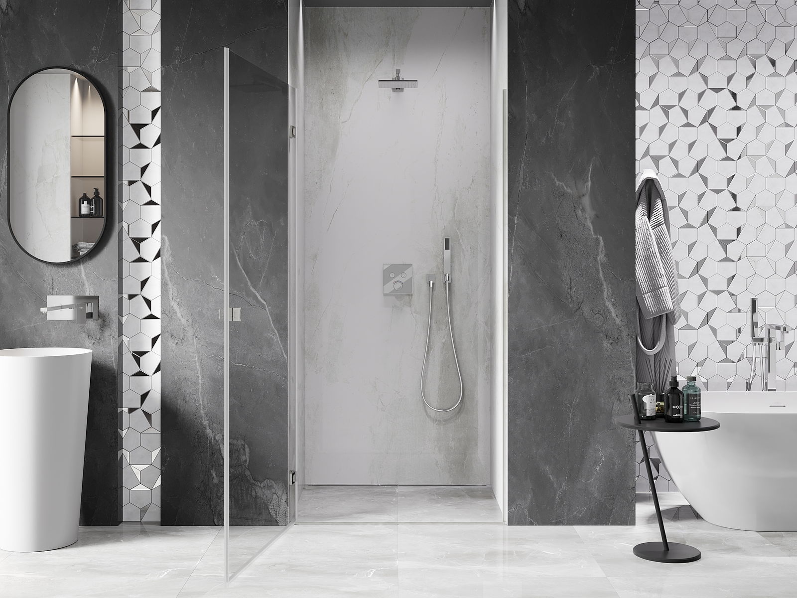 Praktická a pohodlná rukojeť je vyrobena z odolného a trvanlivého kovu. Moderní tvar ve spojení s povrchovou úpravou, která ladí s barvou profilů, dodává celku moderní a stylový vzhled, zdůrazňující estetiku každé koupelny.