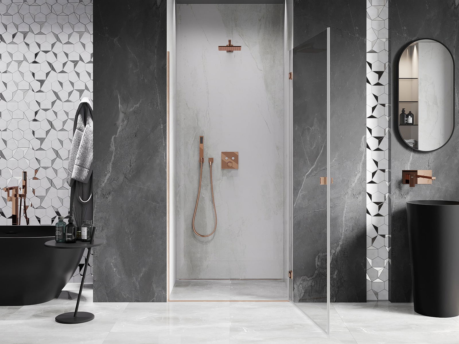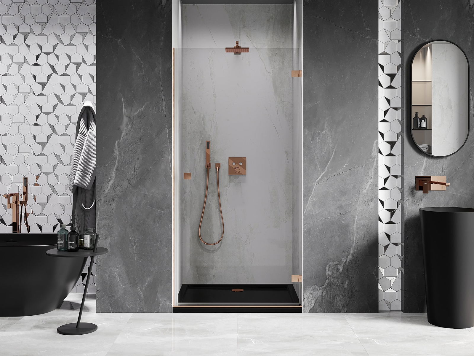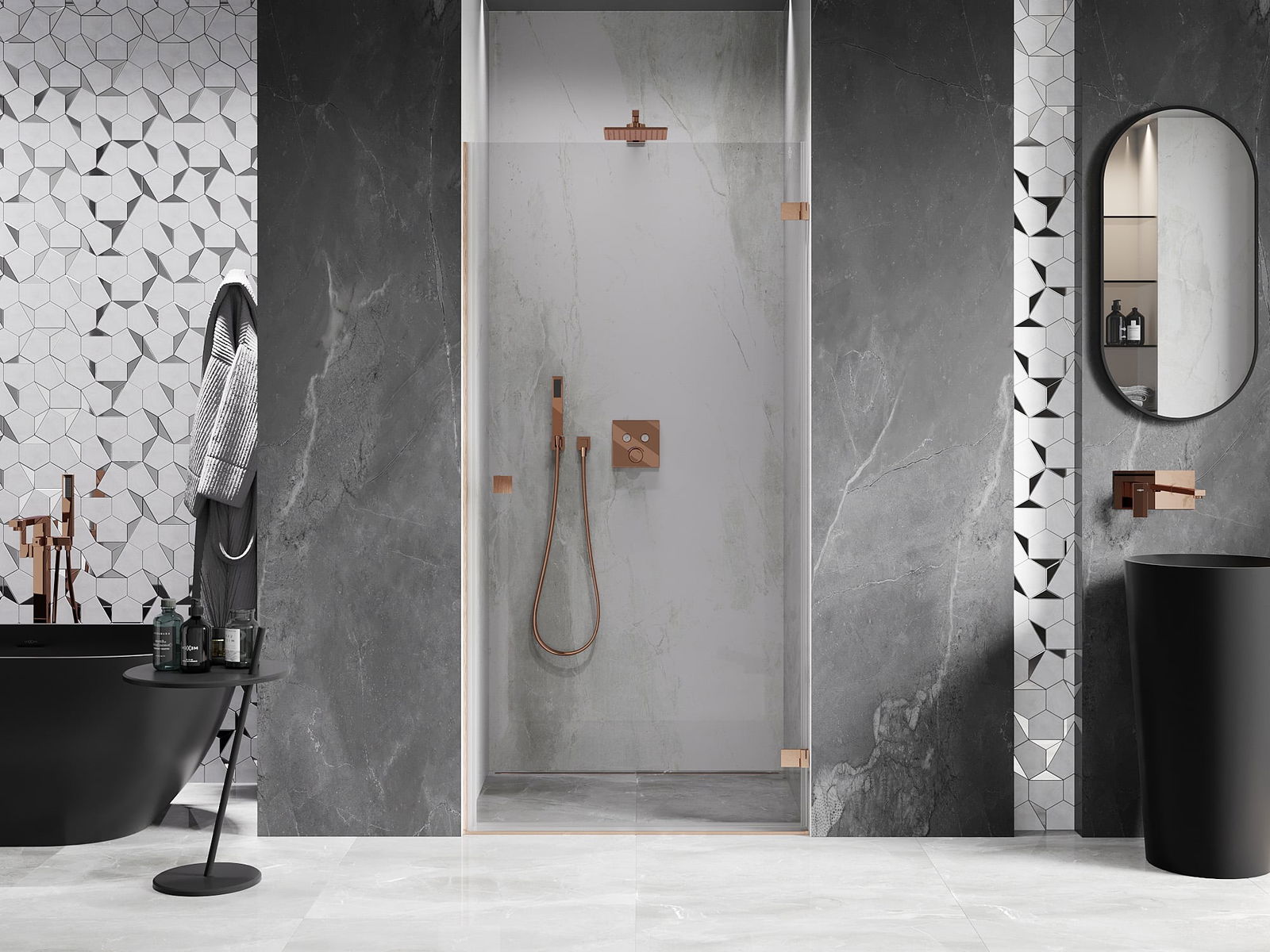 Praktická a pohodlná rukojeť je vyrobena z odolného a trvanlivého kovu. Moderní tvar ve spojení s povrchovou úpravou, která ladí s barvou profilů, dodává celku moderní a stylový vzhled, zdůrazňující estetiku každé koupelny.