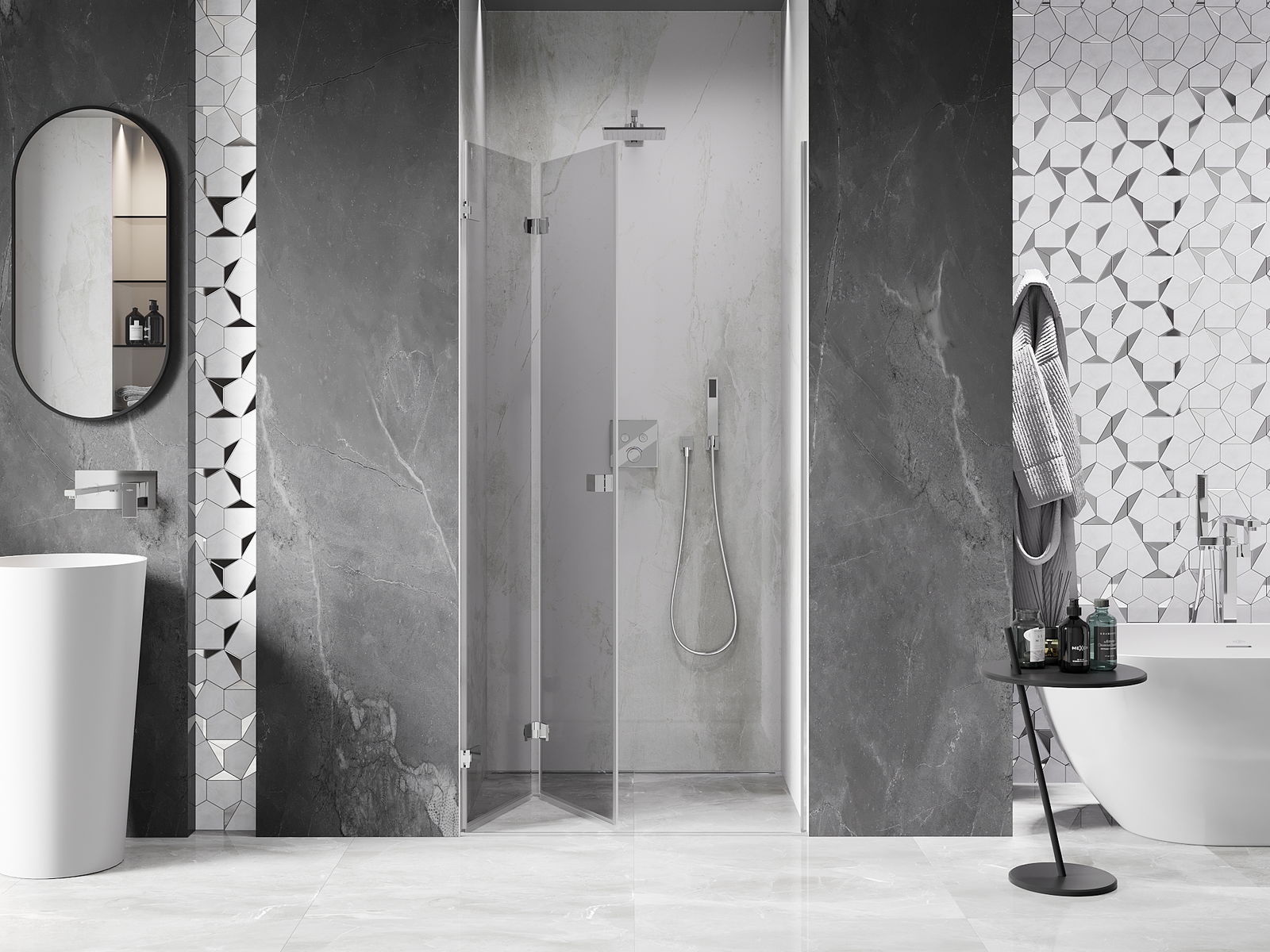 Možnost skládání dveří, jak dovnitř, tak ven, umožňuje získat více prostoru při nepoužívání sprchy. Je to ideální řešení pro menší koupelny, maximálně využívající dostupný prostor.