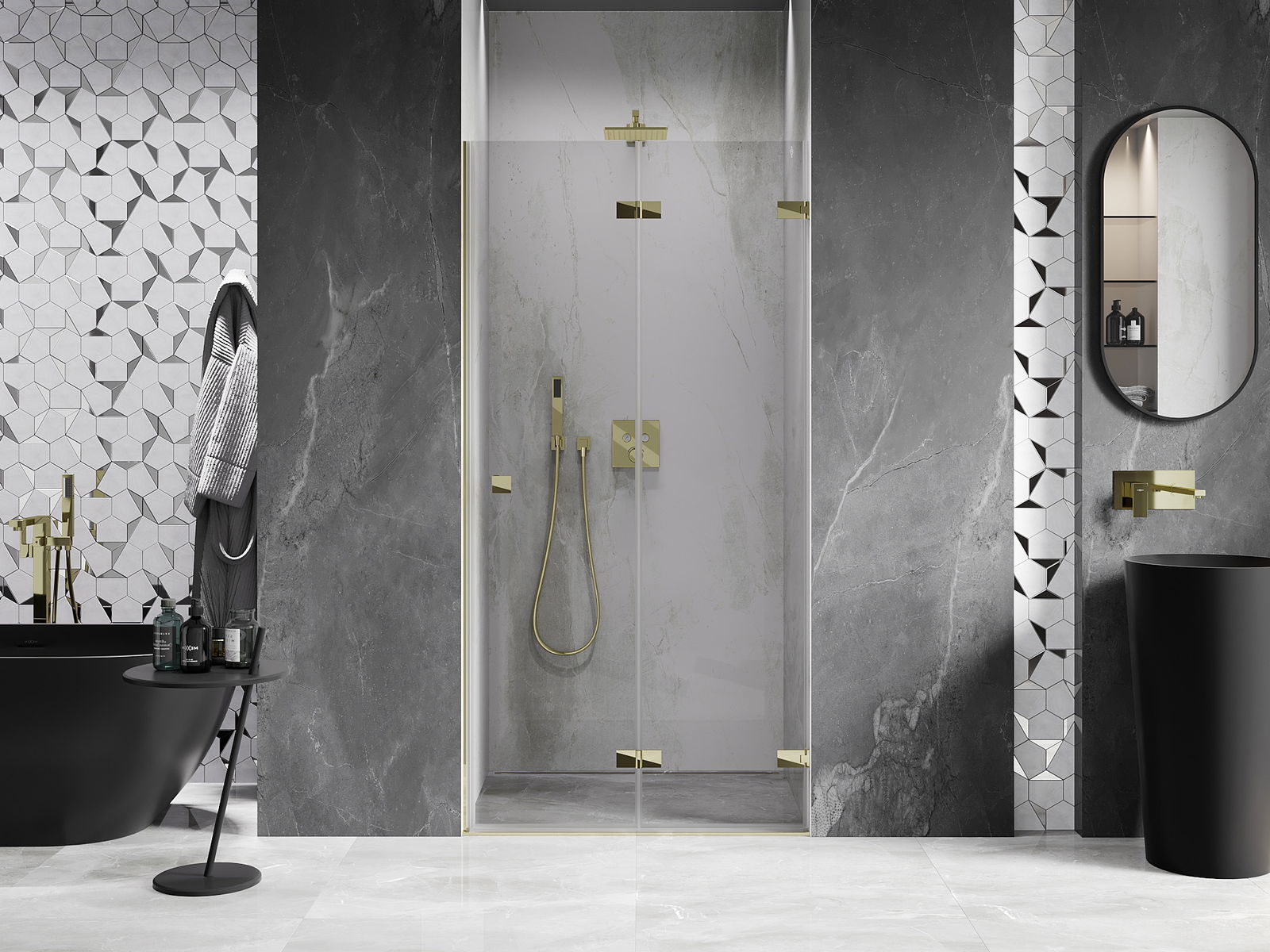 Možnost skládání dveří, jak dovnitř, tak ven, umožňuje získat více prostoru při nepoužívání sprchy. Je to ideální řešení pro menší koupelny, maximálně využívající dostupný prostor.