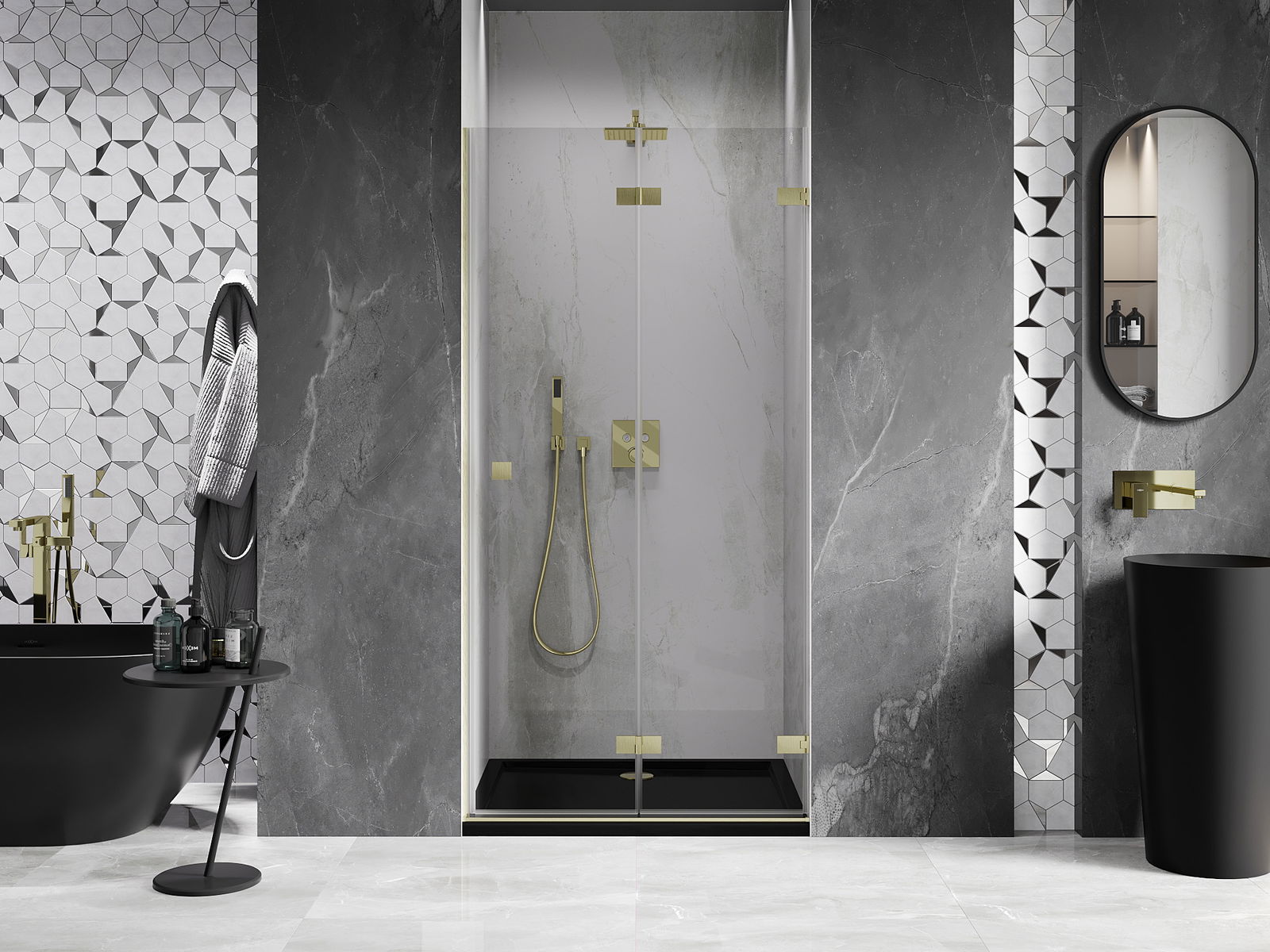 Možnost skládání dveří, jak dovnitř, tak ven, umožňuje získat více prostoru při nepoužívání sprchy. Je to ideální řešení pro menší koupelny, maximálně využívající dostupný prostor.