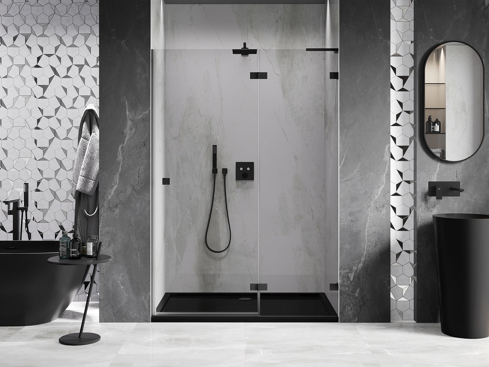Praktická a pohodlná rukojeť je vyrobena z odolného a trvanlivého kovu. Moderní tvar ve spojení s povrchovou úpravou, která ladí s barvou profilů, dodává celku moderní a stylový vzhled, zdůrazňující estetiku každé koupelny.
