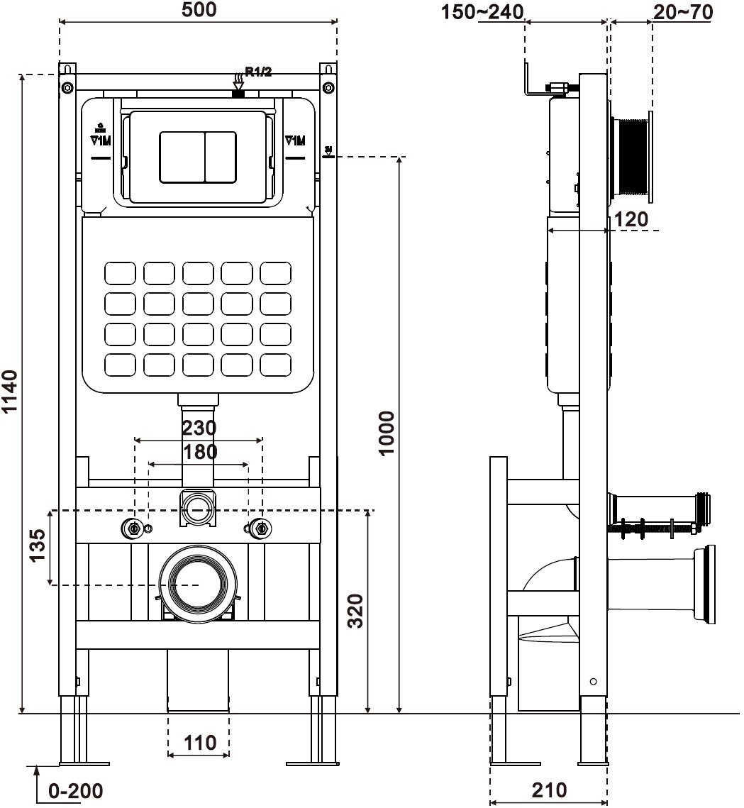 Mexen Tex Air F je volně stojící podomítkový rám s pneumatickou funkcí splachování. Díky výšce 114 cm, šířce 50 cm a hloubce 12 cm je ideální k montáži do plných stěn i sádrokartonu. Nabízí kompatibilitu se závěsnými miskami s roztečí otvorů 18 cm nebo 23 cm. Má nastavitelné pozinkované nožky a podpěry, což usnadňuje montáž na podklad o tloušťce 0-20 cm. Nádrž s protikondenzní izolací zajišťuje trvanlivost a regulace množství splachované vody (6/9 L, 4,5/3 L) poskytuje úspornost. Ideální ke kombinaci s tlačítky Mexen ze série Tex.
