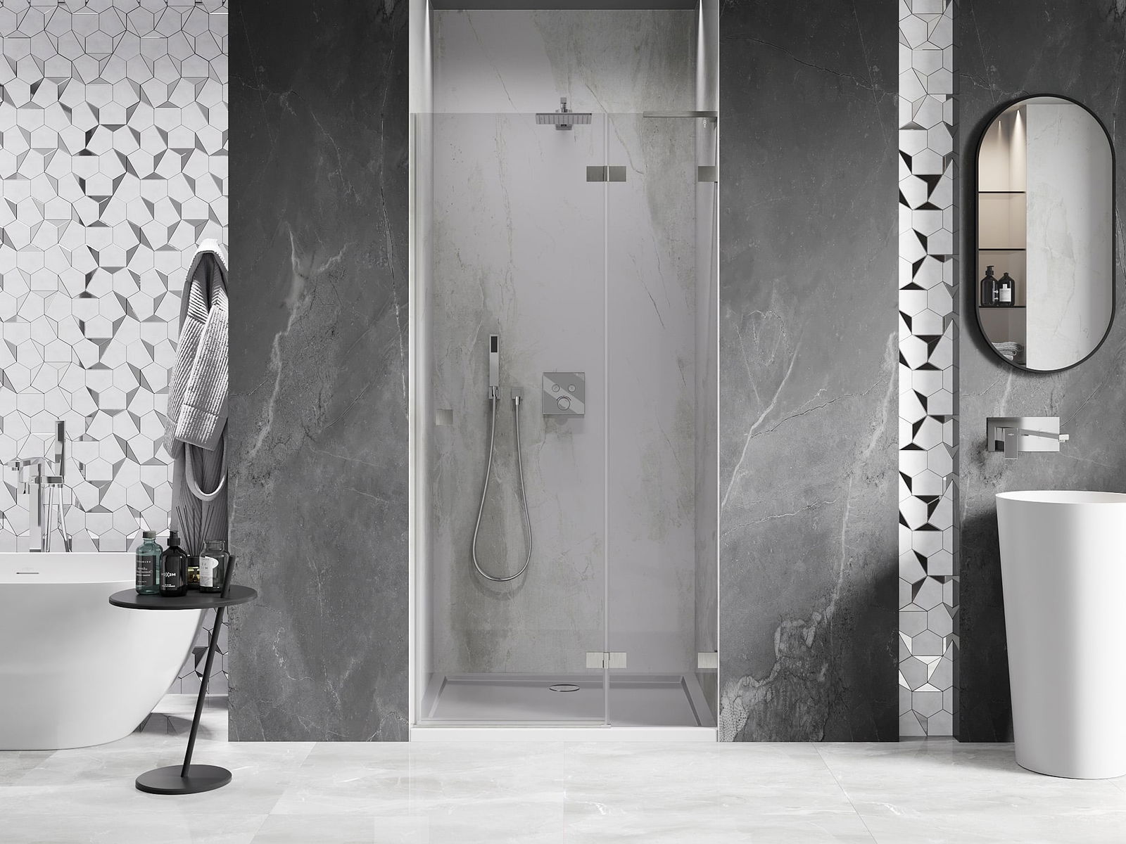 Praktická a pohodlná rukojeť je vyrobena z odolného a trvanlivého kovu. Moderní tvar ve spojení s povrchovou úpravou, která ladí s barvou profilů, dodává celku moderní a stylový vzhled, zdůrazňující estetiku každé koupelny.