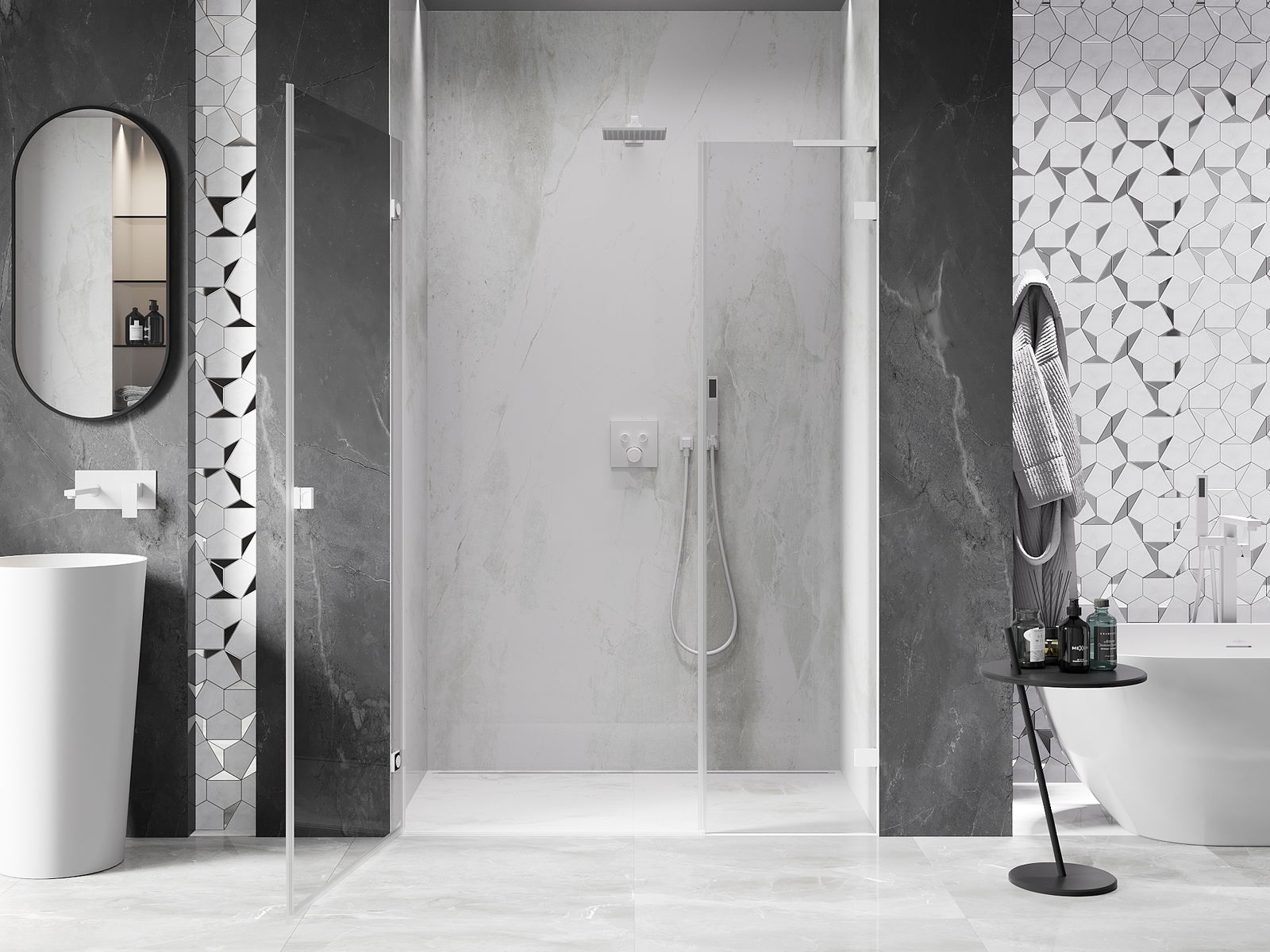 Praktická a pohodlná rukojeť je vyrobena z odolného a trvanlivého kovu. Moderní tvar ve spojení s povrchovou úpravou, která ladí s barvou profilů, dodává celku moderní a stylový vzhled, zdůrazňující estetiku každé koupelny.
