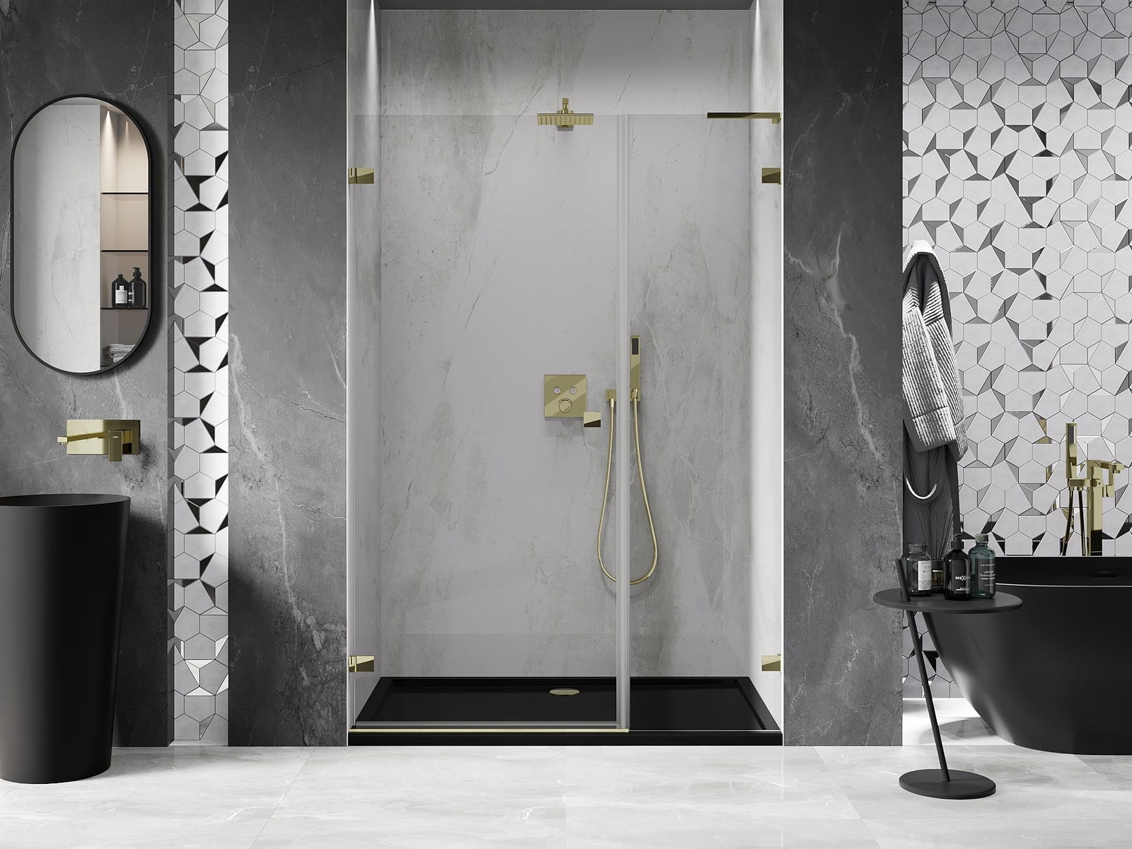 Praktická a pohodlná rukojeť je vyrobena z odolného a trvanlivého kovu. Moderní tvar ve spojení s povrchovou úpravou, která ladí s barvou profilů, dodává celku moderní a stylový vzhled, zdůrazňující estetiku každé koupelny.