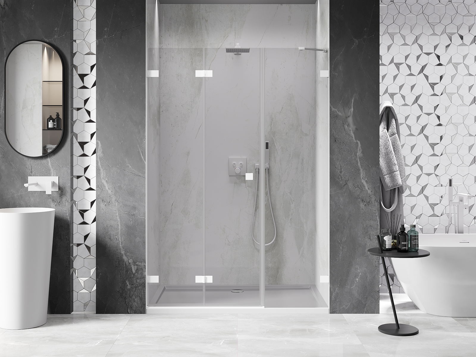 Možnost skládání dveří, jak dovnitř, tak ven, umožňuje získat více prostoru při nepoužívání sprchy. Je to ideální řešení pro menší koupelny, maximálně využívající dostupný prostor.