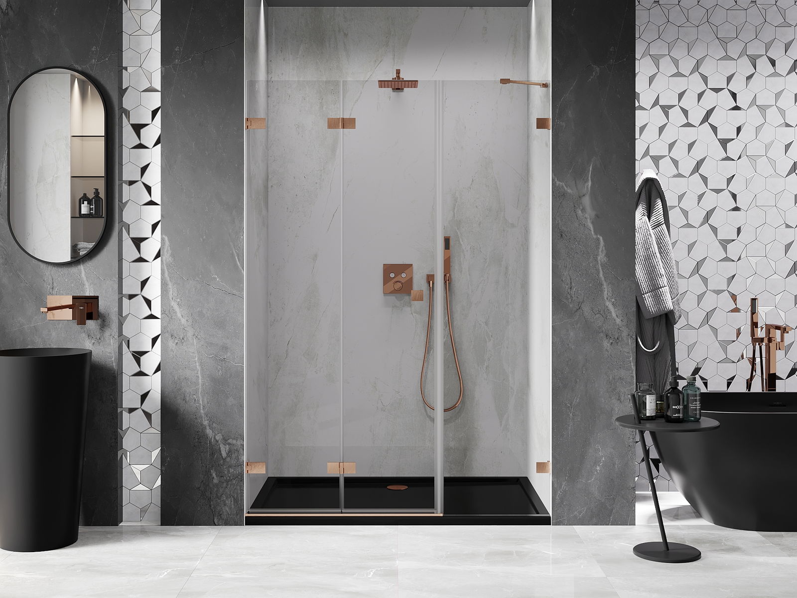 Možnost skládání dveří, jak dovnitř, tak ven, umožňuje získat více prostoru při nepoužívání sprchy. Je to ideální řešení pro menší koupelny, maximálně využívající dostupný prostor.
