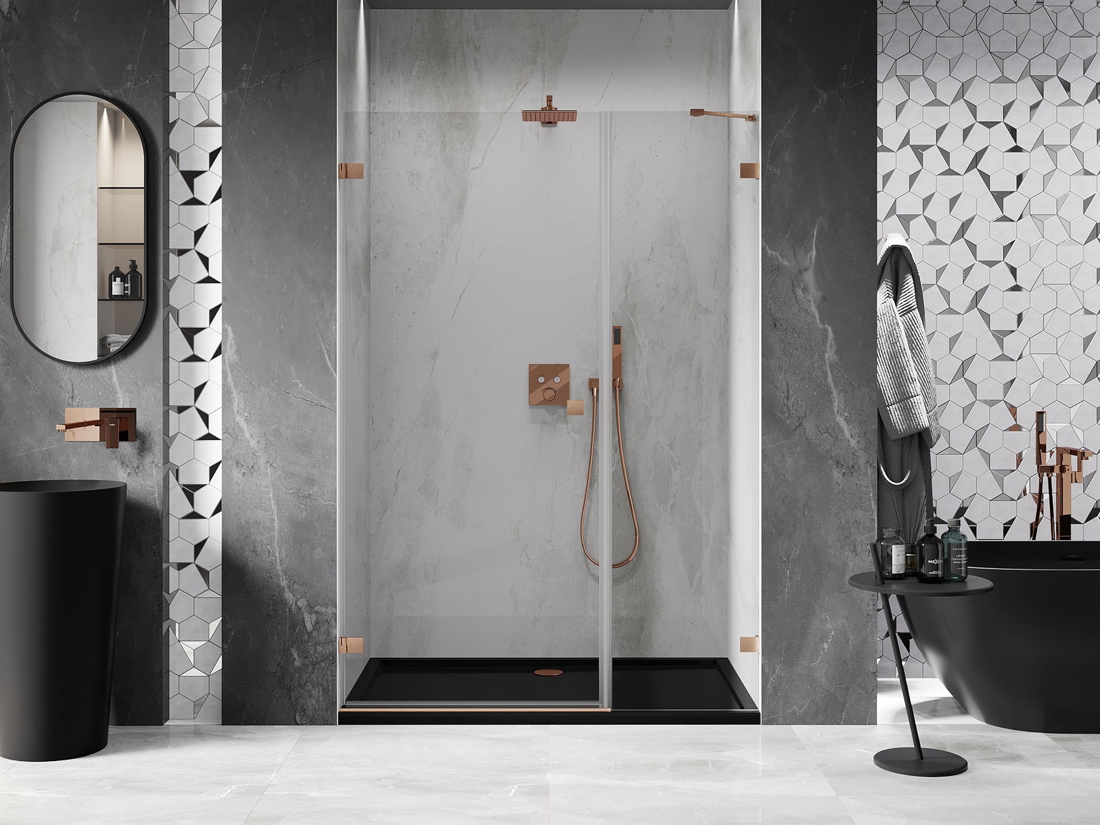 Praktická a pohodlná rukojeť je vyrobena z odolného a trvanlivého kovu. Moderní tvar ve spojení s povrchovou úpravou, která ladí s barvou profilů, dodává celku moderní a stylový vzhled, zdůrazňující estetiku každé koupelny.