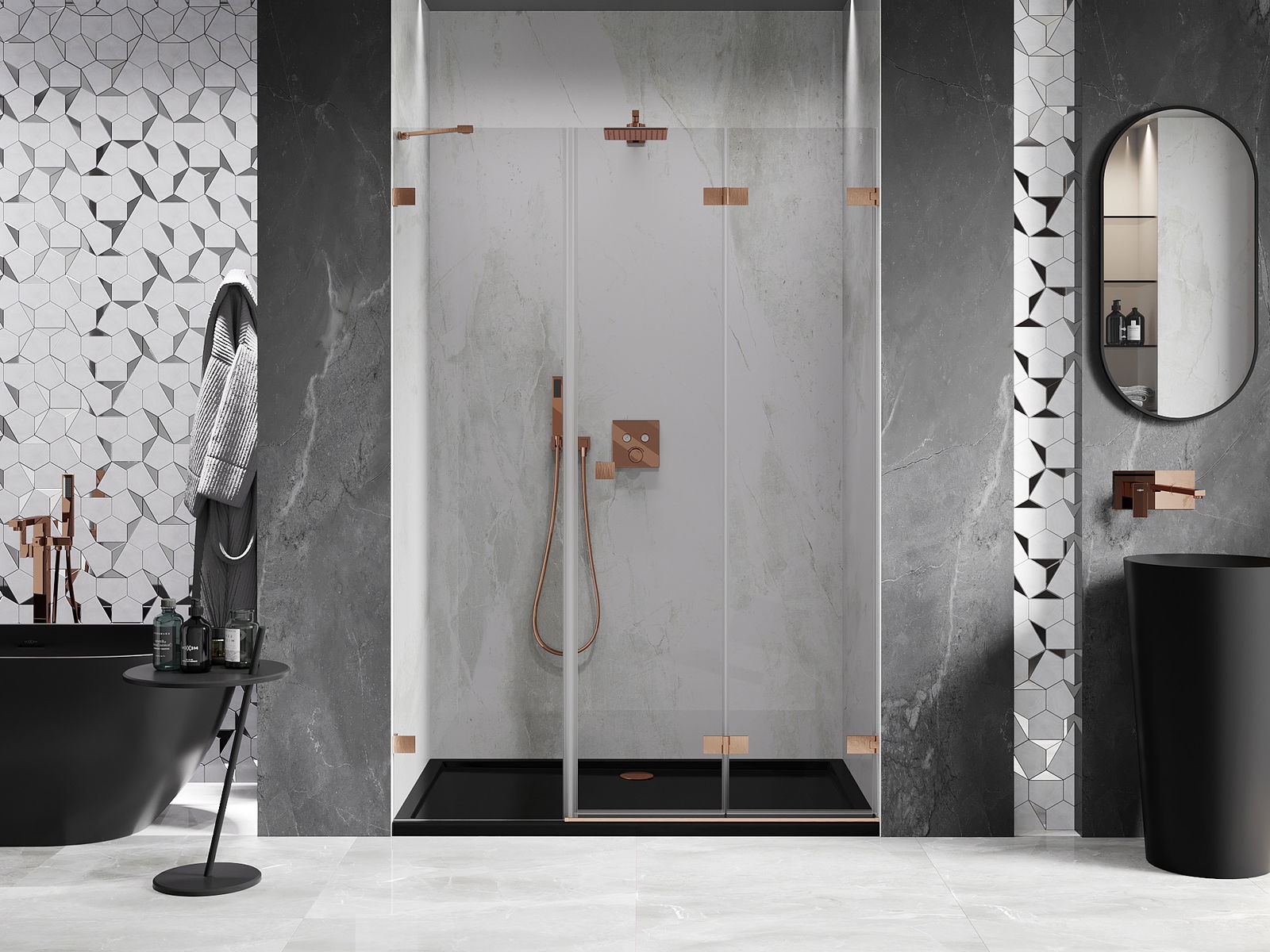 Možnost skládání dveří, jak dovnitř, tak ven, umožňuje získat více prostoru při nepoužívání sprchy. Je to ideální řešení pro menší koupelny, maximálně využívající dostupný prostor.