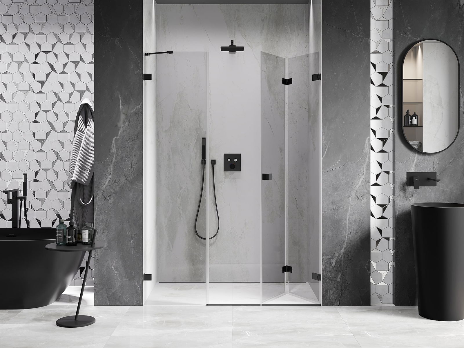 Možnost skládání dveří, jak dovnitř, tak ven, umožňuje získat více prostoru při nepoužívání sprchy. Je to ideální řešení pro menší koupelny, maximálně využívající dostupný prostor.