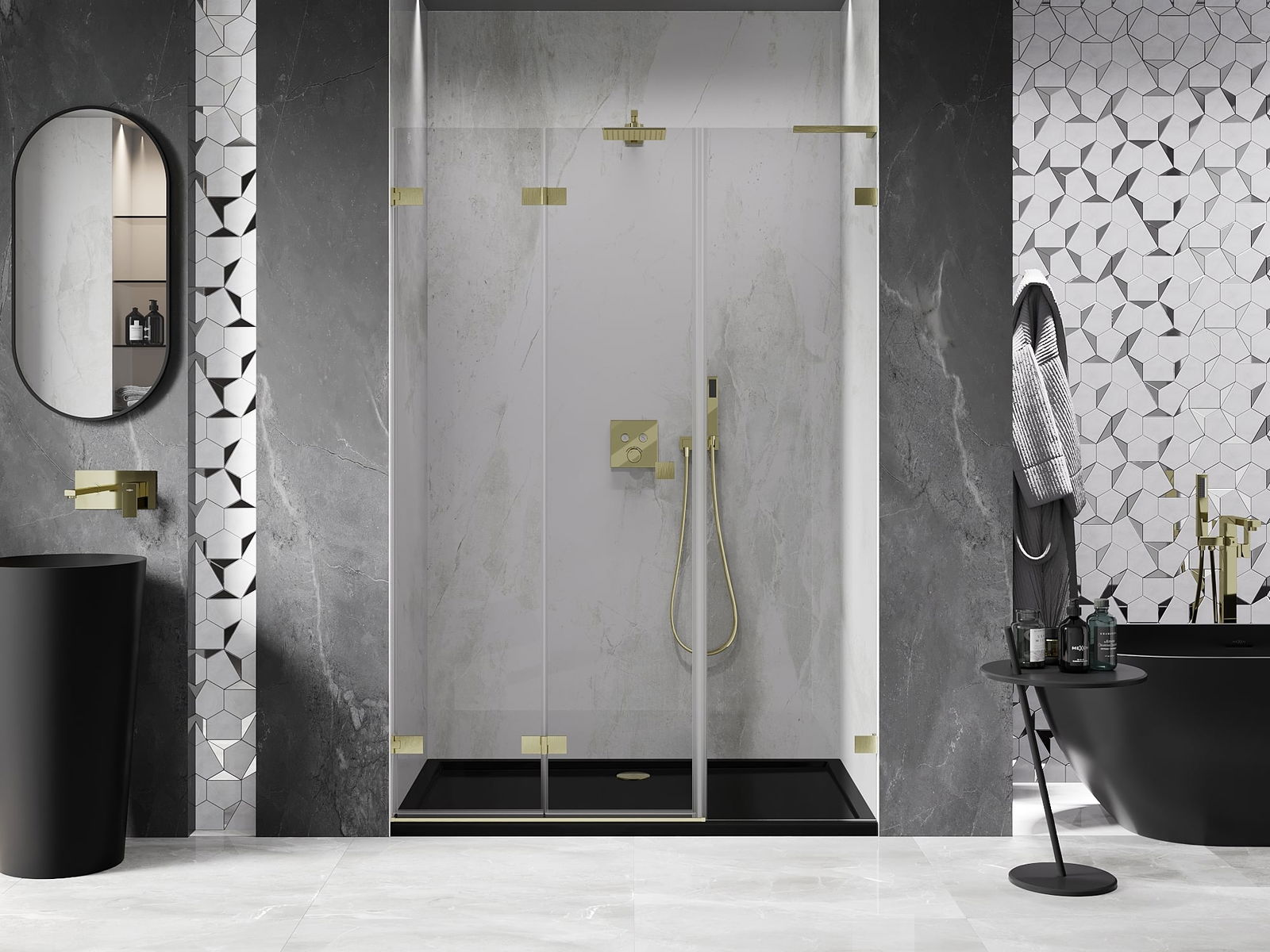 Možnost skládání dveří, jak dovnitř, tak ven, umožňuje získat více prostoru při nepoužívání sprchy. Je to ideální řešení pro menší koupelny, maximálně využívající dostupný prostor.