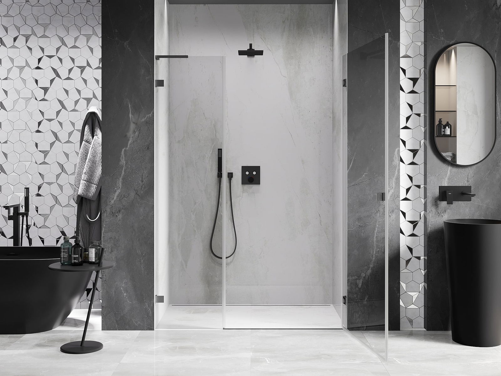 Praktická a pohodlná rukojeť je vyrobena z odolného a trvanlivého kovu. Moderní tvar ve spojení s povrchovou úpravou, která ladí s barvou profilů, dodává celku moderní a stylový vzhled, zdůrazňující estetiku každé koupelny.