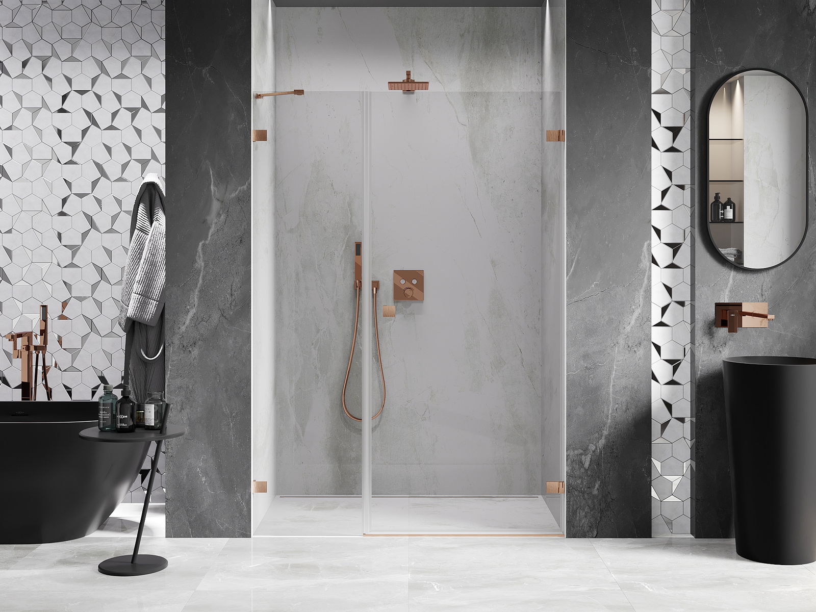 Praktická a pohodlná rukojeť je vyrobena z odolného a trvanlivého kovu. Moderní tvar ve spojení s povrchovou úpravou, která ladí s barvou profilů, dodává celku moderní a stylový vzhled, zdůrazňující estetiku každé koupelny.