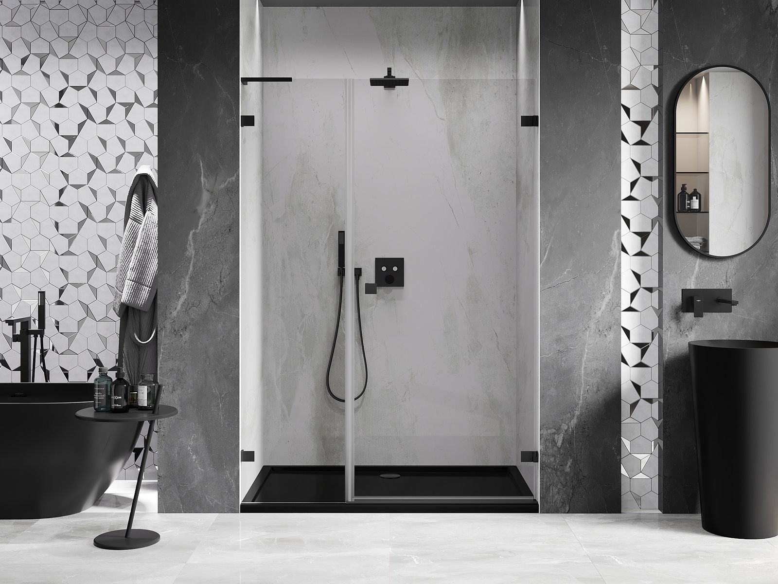 Praktická a pohodlná rukojeť je vyrobena z odolného a trvanlivého kovu. Moderní tvar ve spojení s povrchovou úpravou, která ladí s barvou profilů, dodává celku moderní a stylový vzhled, zdůrazňující estetiku každé koupelny.