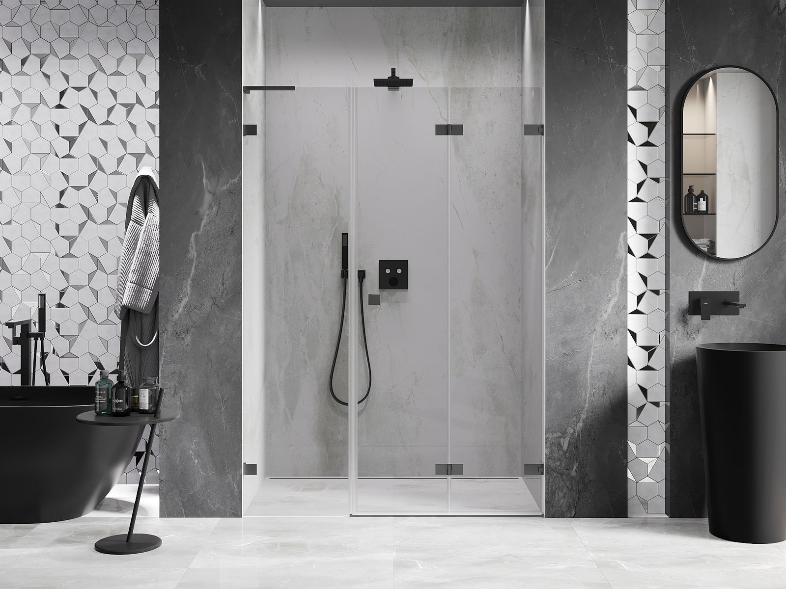 Možnost skládání dveří, jak dovnitř, tak ven, umožňuje získat více prostoru při nepoužívání sprchy. Je to ideální řešení pro menší koupelny, maximálně využívající dostupný prostor.