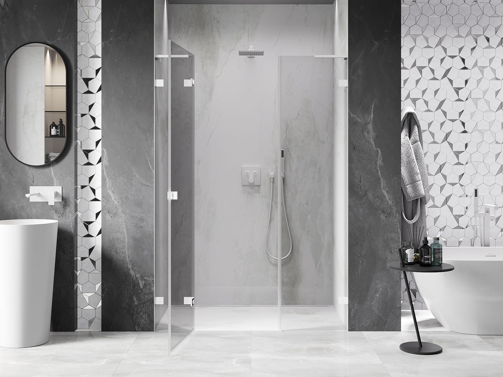 Praktická a pohodlná rukojeť je vyrobena z odolného a trvanlivého kovu. Moderní tvar ve spojení s povrchovou úpravou, která ladí s barvou profilů, dodává celku moderní a stylový vzhled, zdůrazňující estetiku každé koupelny.
