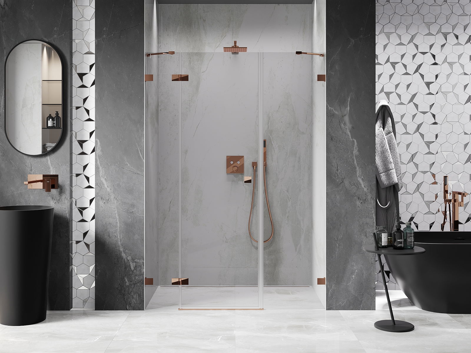 Spony a závěsy byly vyrobeny z velmi odolné mosazi a navíc vytvářejí zarovnanou plochu skla. Je to vynikající volba, která kombinuje eleganci, odolnost a moderní design. Díky těmto řešením získává sprcha na estetice a zároveň usnadňuje udržování čistoty.