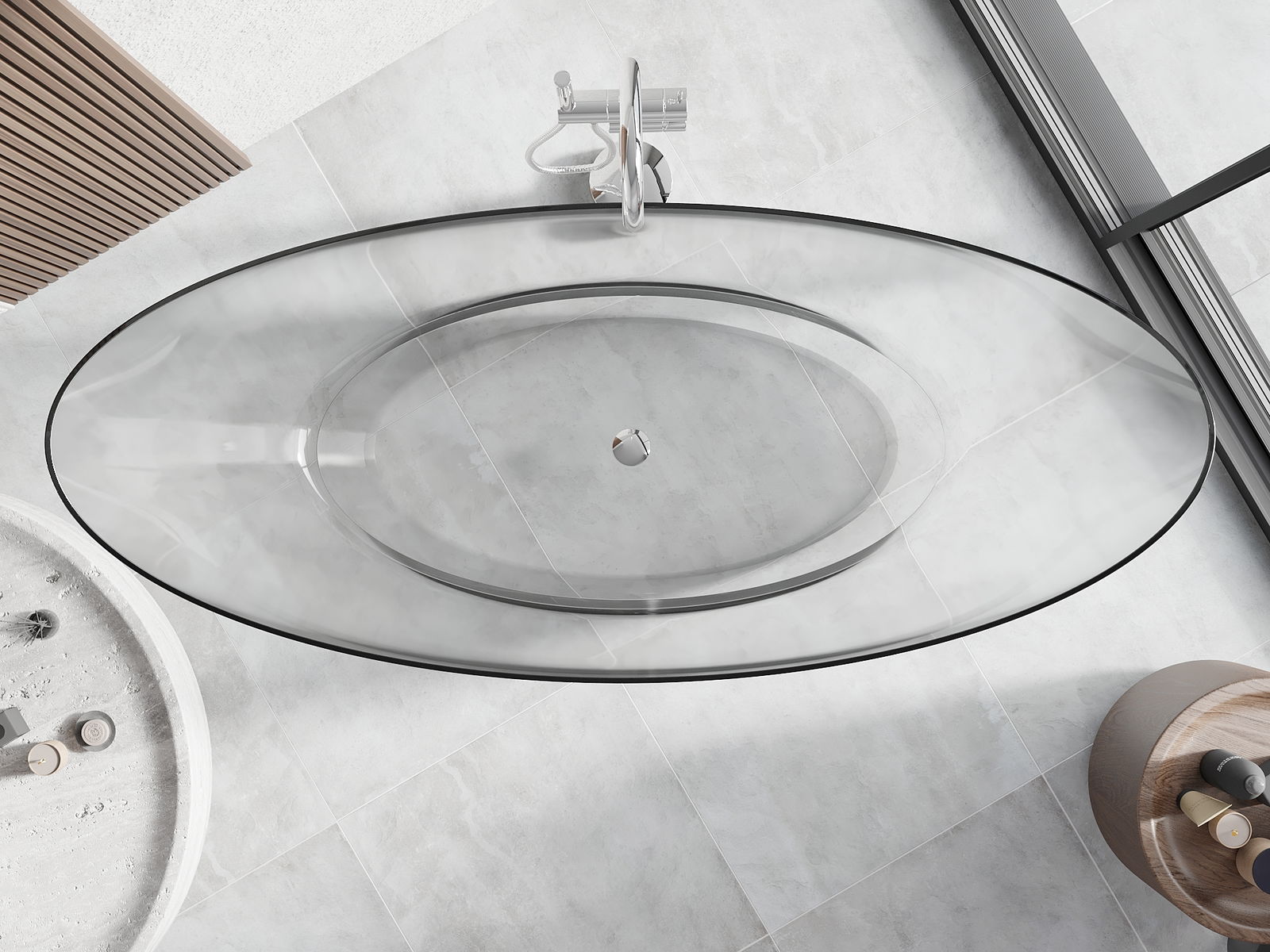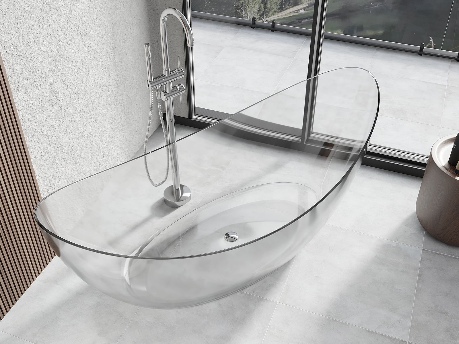 Jedná se o moderní materiál spojující elegantní vzhled s vysokou odolností. Je odolný vůči mechanickému poškození, snadno se čistí a je příjemný na dotek. Průhledná forma a tenký okraj vany jí dodávají lehkost a jedinečný charakter, čímž vytvářejí působivý prvek v uspořádání koupelny.