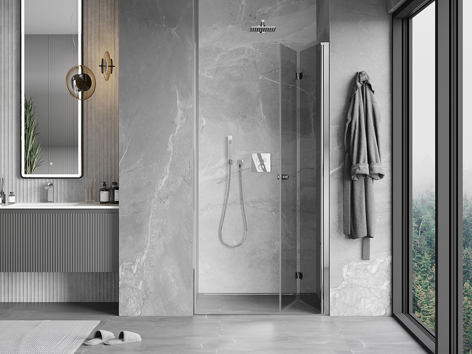 Možnost skládání dveří, jak dovnitř, tak ven, umožňuje získat více prostoru při nepoužívání sprchy. Je to ideální řešení pro menší koupelny, maximálně využívající dostupný prostor.