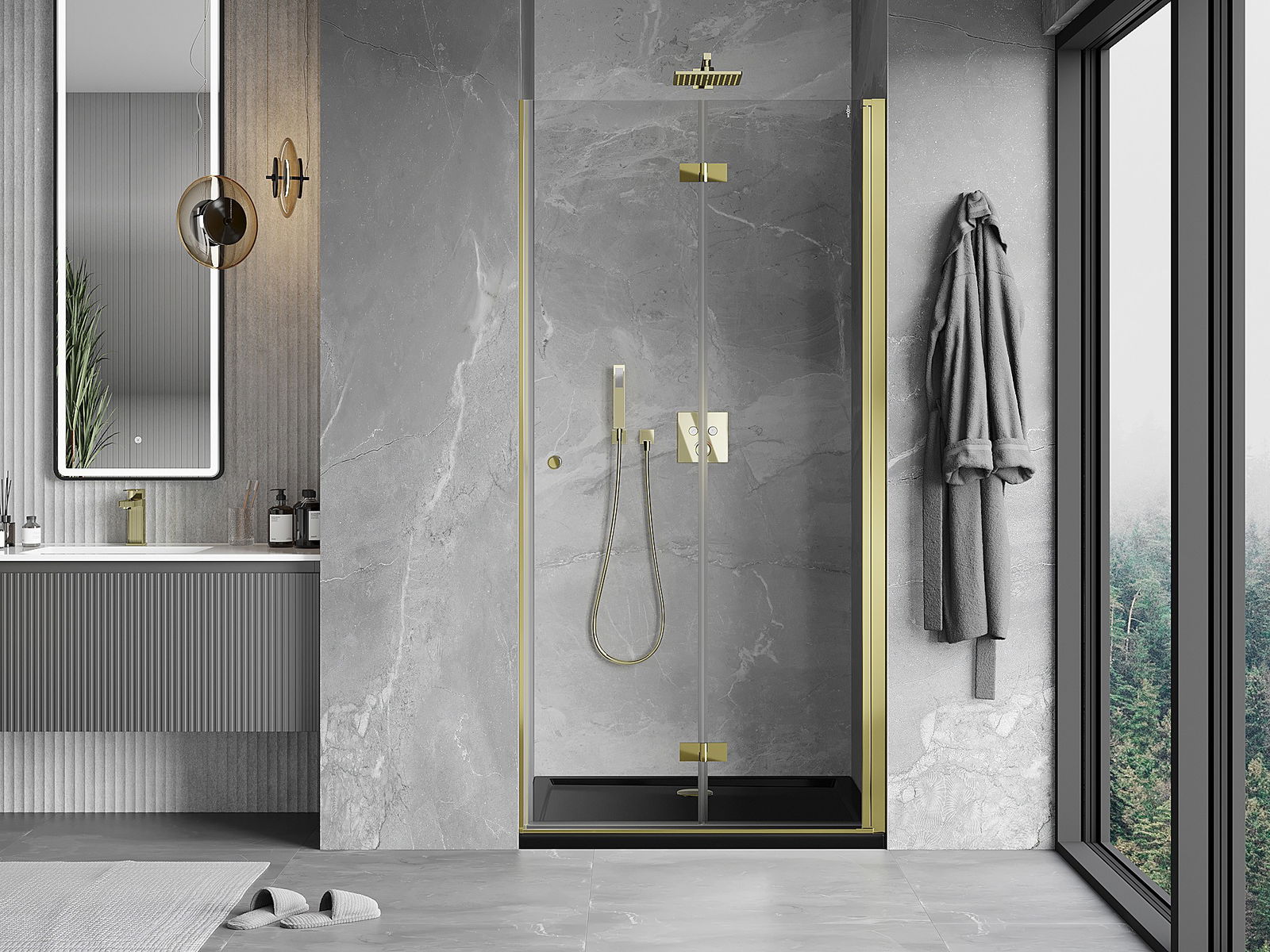 Mexen Mist-F sprchové dveře skládací pravé 90 cm, transparentní, zlaté - 8A6-090-000-50-00-P