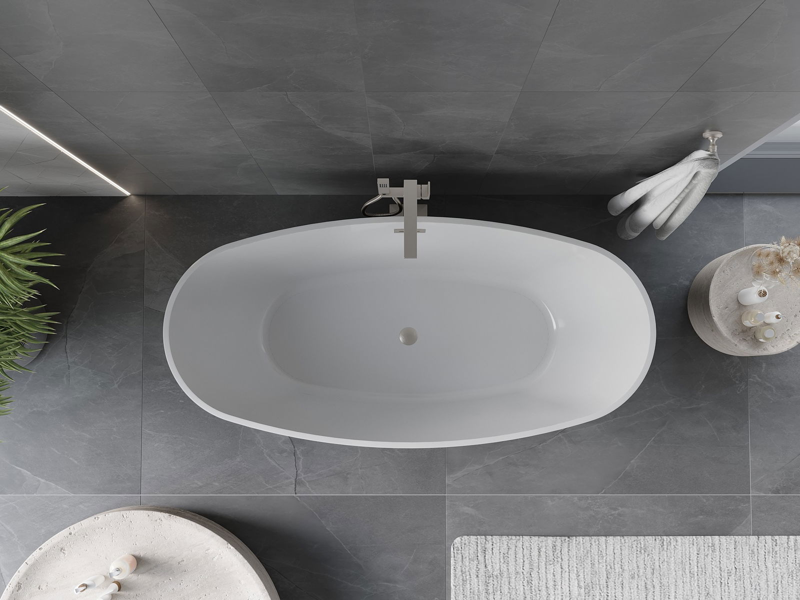 Jedná se o moderní materiál spojující elegantní vzhled s vysokou odolností. Je odolný vůči mechanickému poškození, snadno se čistí a je příjemný na dotek. Průhledná forma a tenký okraj vany jí dodávají lehkost a jedinečný charakter, čímž vytvářejí působivý prvek v uspořádání koupelny.