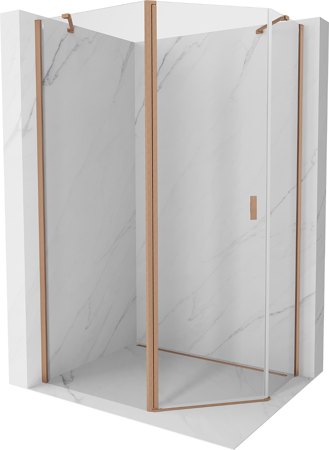 Mexen Mist asymetrická otočná pětistranná sprchová kabina 90 x 80 cm, transparentní, kartáčovaná měď