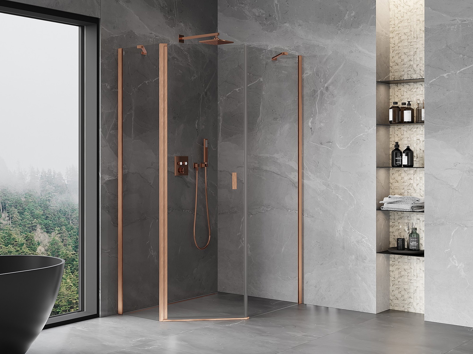 Mexen Mist asymetrická pětiboká sprchová kabina otočná 80 x 100 cm, transparentní, kartáčovaná měď