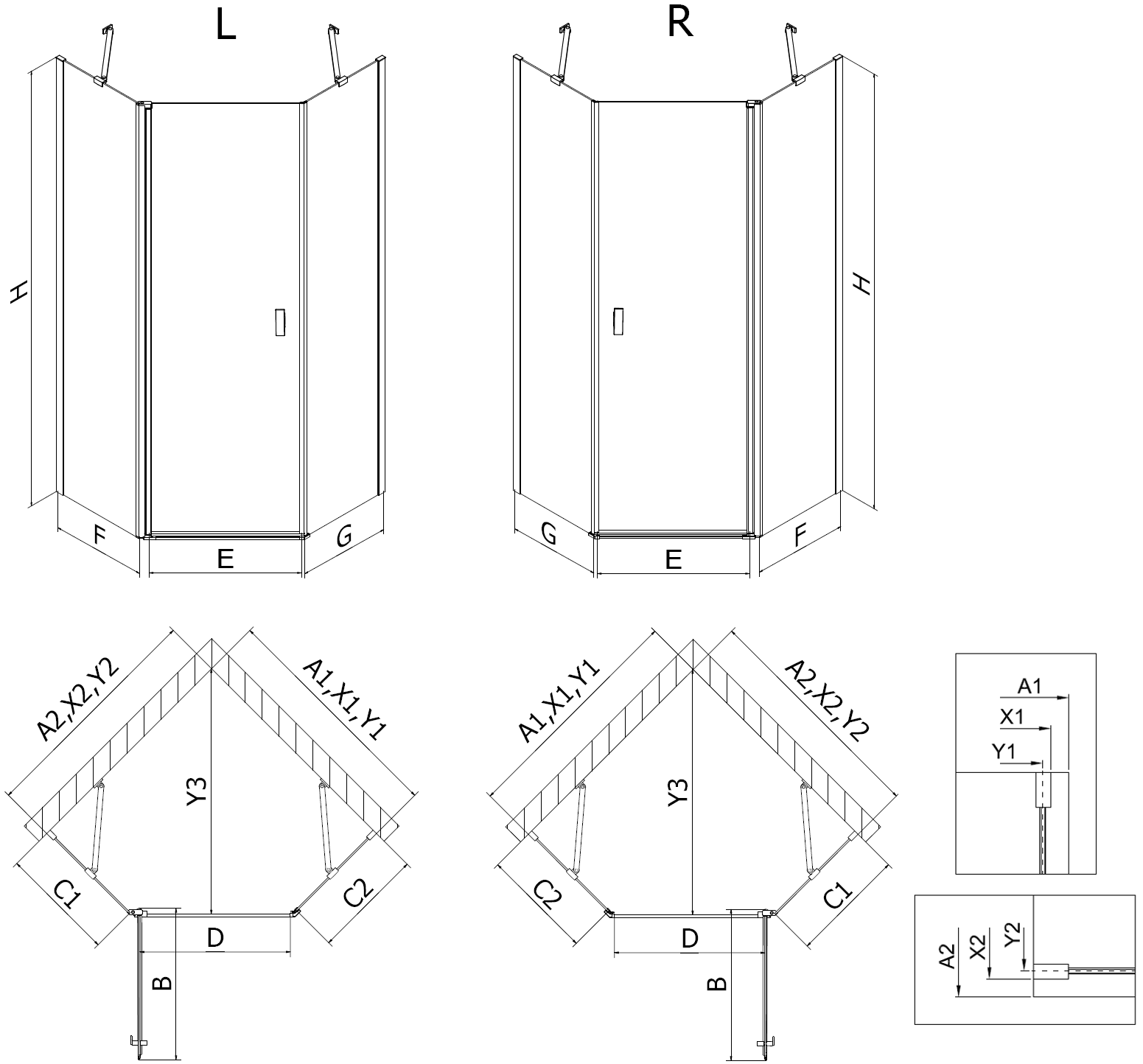 Rozměr: 100x100 cm (pravé dveře 100 cm, stěna 100 cm)