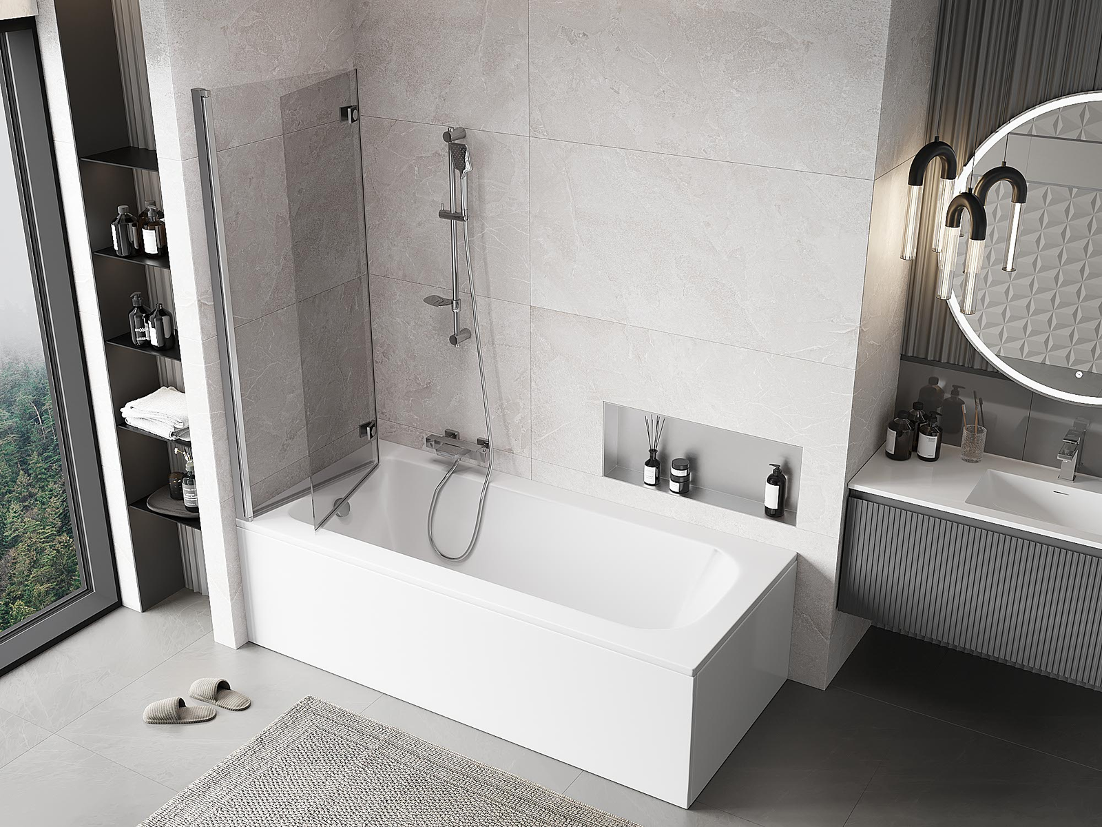 Paravan vyrobený ze dvou křídel s možností složení. Takové řešení umožňuje ušetřit více místa v koupelně a umožňuje volné využití zbývajícího prostoru, když nepoužíváme koupací zónu.