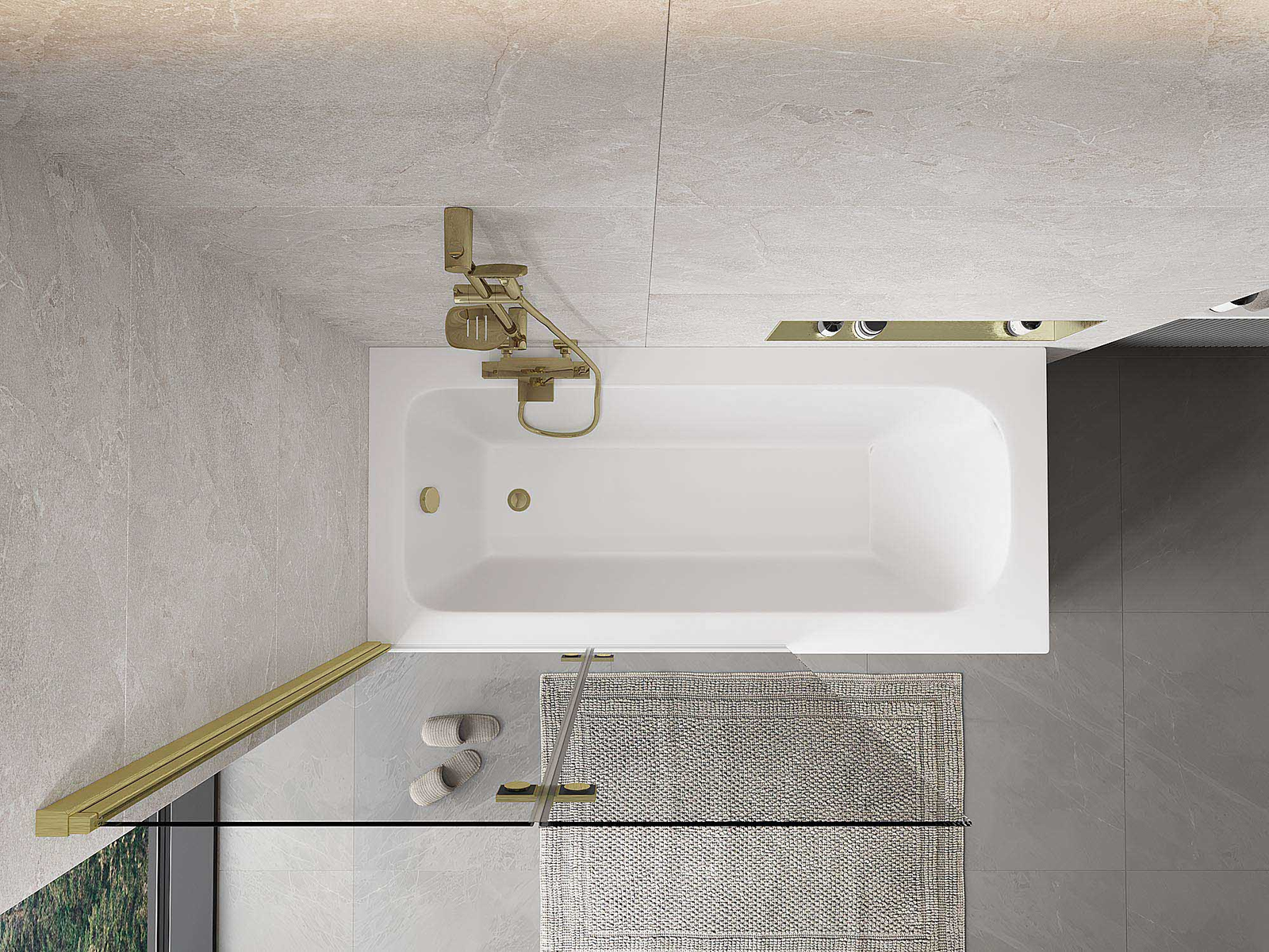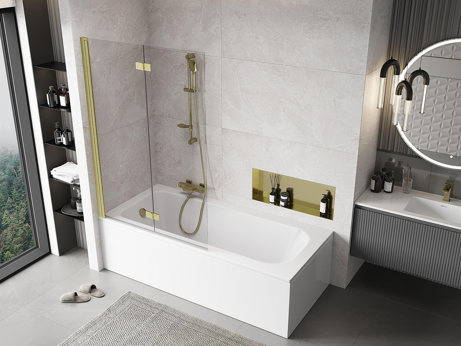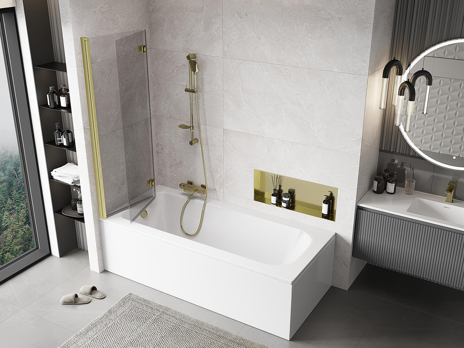 Paravan vyrobený ze dvou křídel s možností složení. Takové řešení umožňuje ušetřit více místa v koupelně a umožňuje volné využití zbývajícího prostoru, když nepoužíváme koupací zónu.