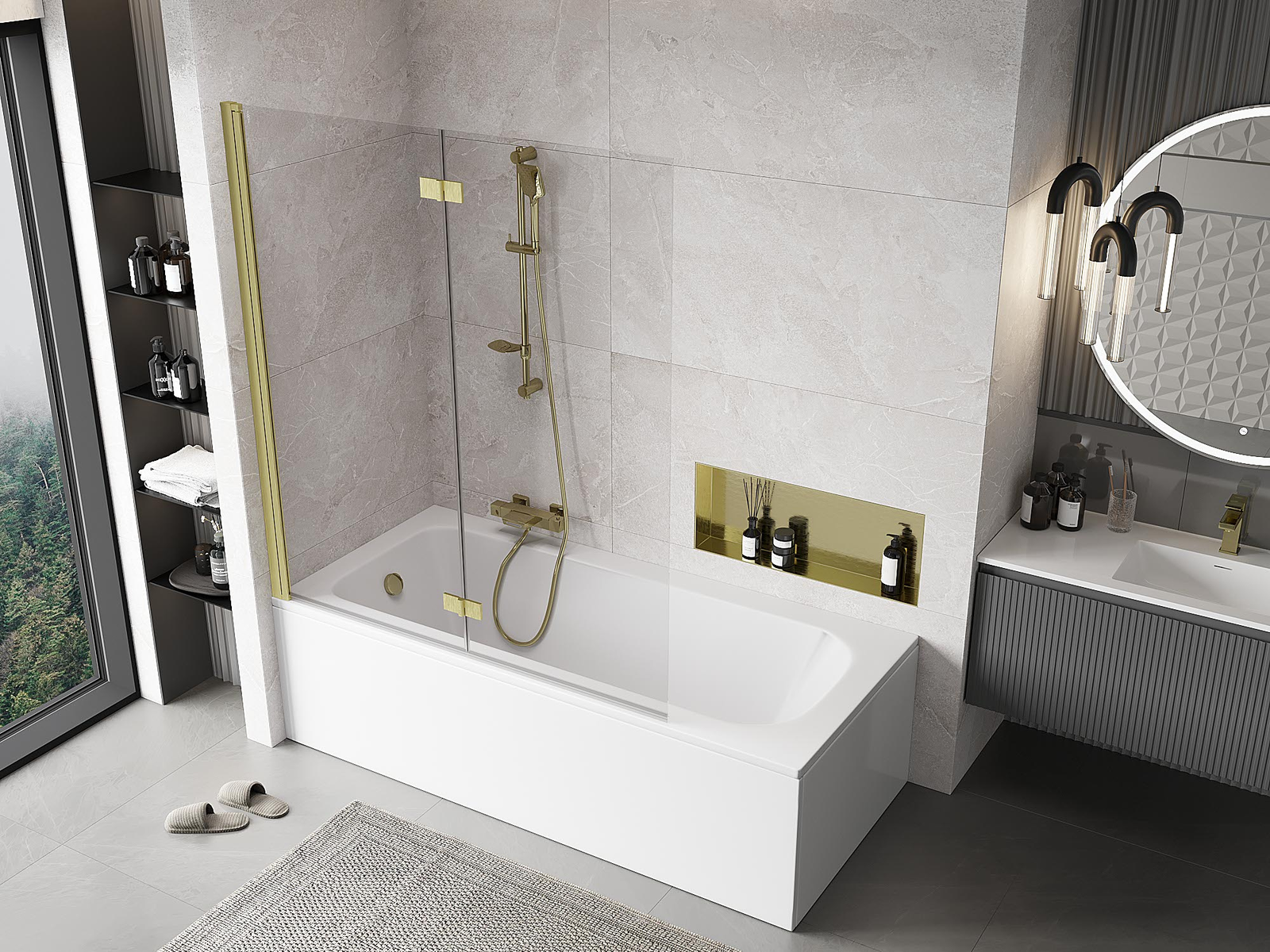 Paravan vyrobený ze dvou křídel s možností složení. Takové řešení umožňuje ušetřit více místa v koupelně a umožňuje volné využití zbývajícího prostoru, když nepoužíváme koupací zónu.