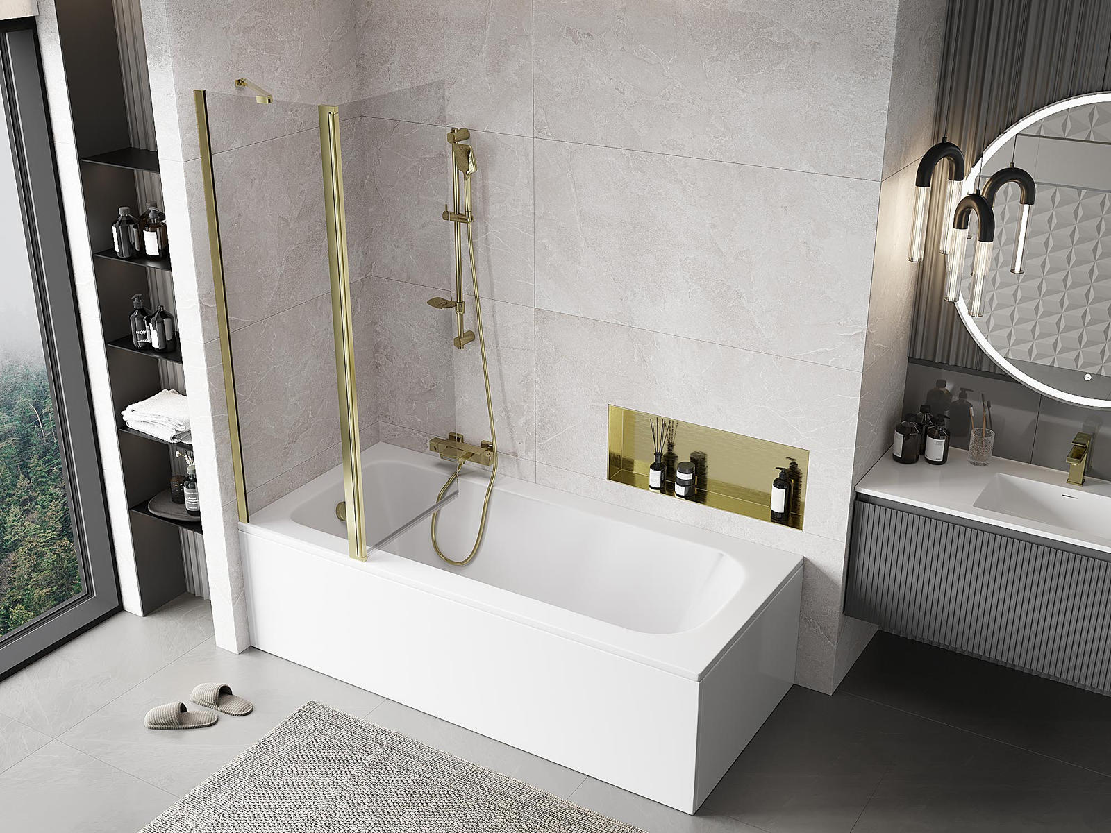 Paravan vyrobený ze dvou křídel s možností složení. Takové řešení umožňuje ušetřit více místa v koupelně a umožňuje volné využití zbývajícího prostoru, když nepoužíváme koupací zónu.