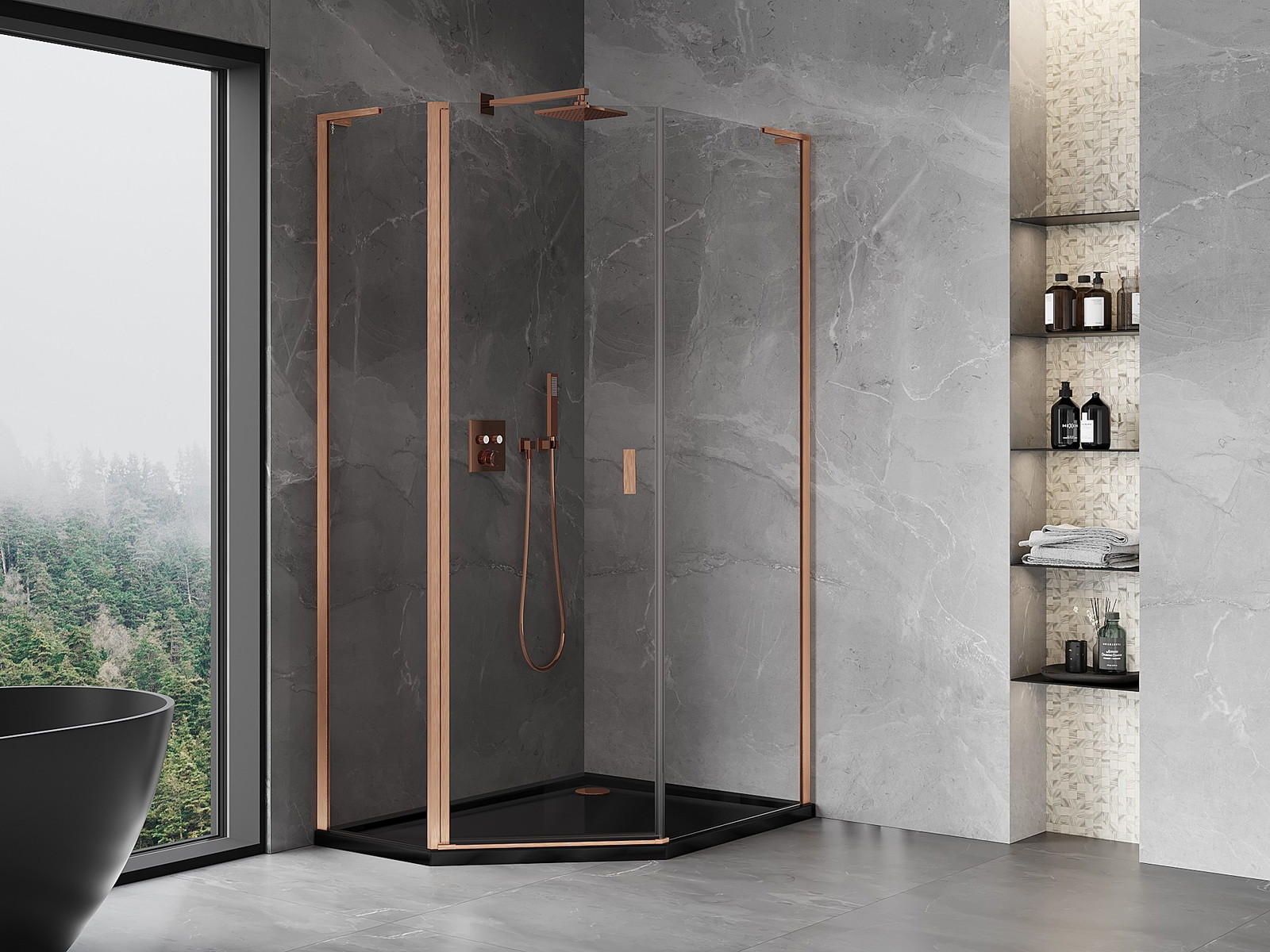Mexen Mist L pětiúhelníková asymetrická sprchová kabina 80x100 cm, transparentní, kartáčovaná měď - 8A8L-080-100-65-00