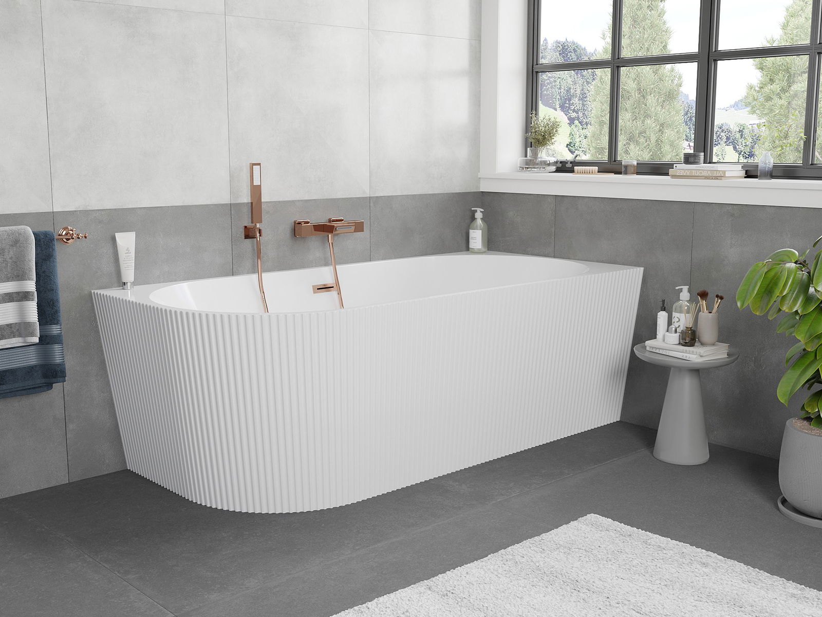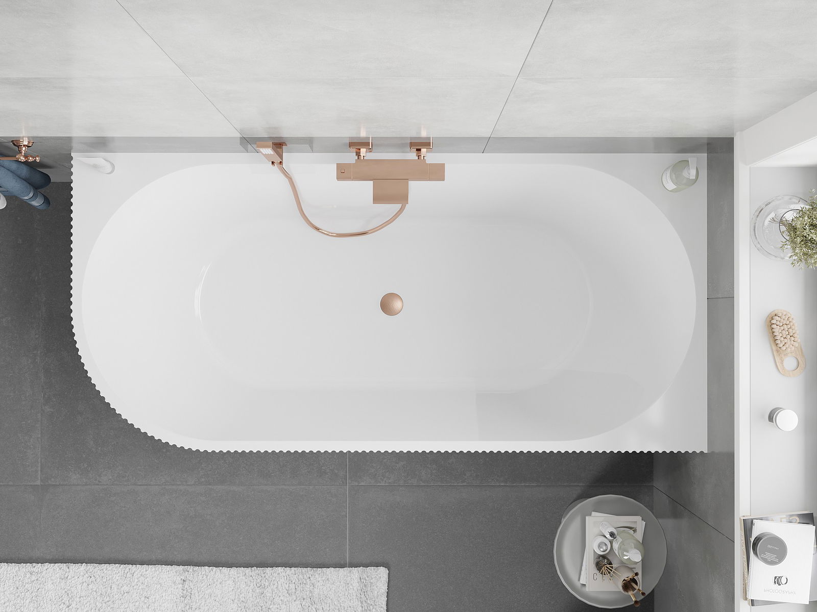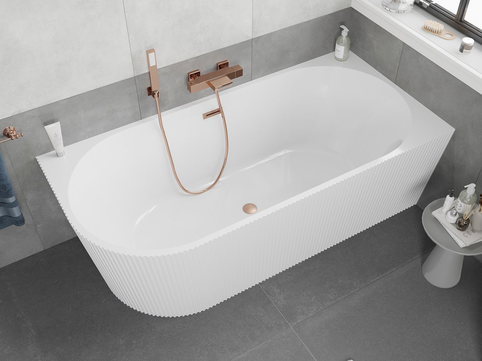 Mexen Silo samostatně stojící rohová vana pravá ribbovaná 150 x 75 cm, bílá, přepad kartáčovaná měď