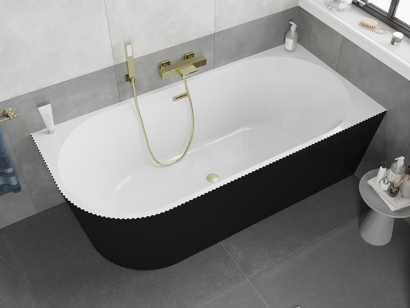 Mexen Silo volně stojící rohová vana pravá rýhovaná 150 x 75 cm, bílá/černá, přepad zlatý kartáčovaný