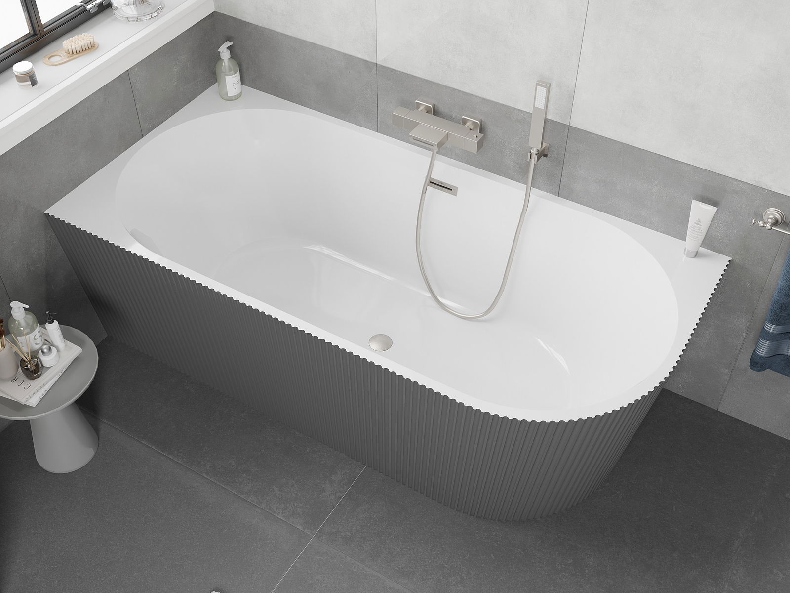 Mexen Silo volně stojící rohová vana levá rýhovaná 150 x 75 cm, bílá/šedá, přepad kartáčovaný nikl - 52891507562L-97