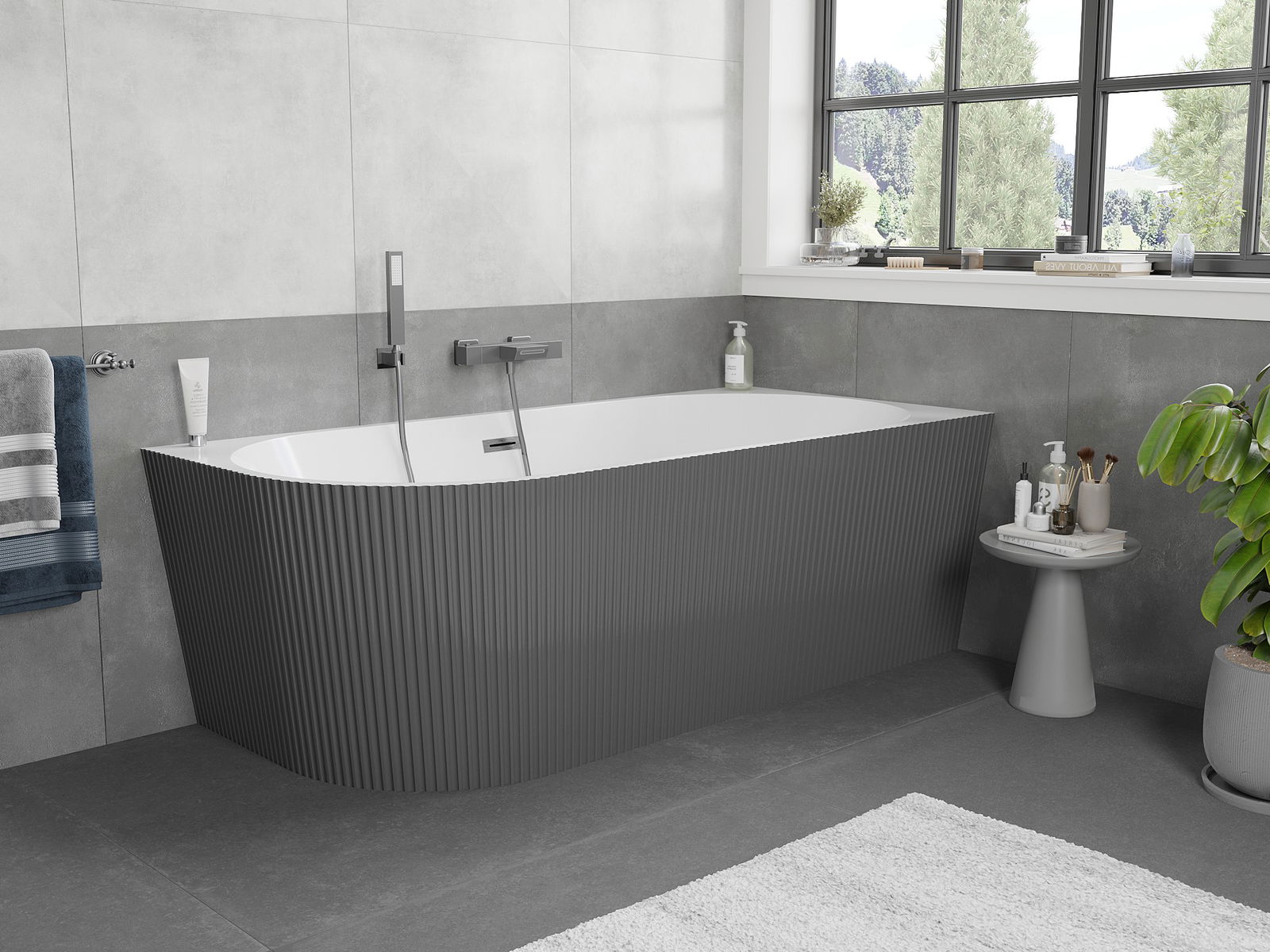 Mexen Silo volně stojící rohová vana pravá s vlnkovým povrchem 150 x 75 cm, bílá/šedá, přepad kartáčovaný gun gray