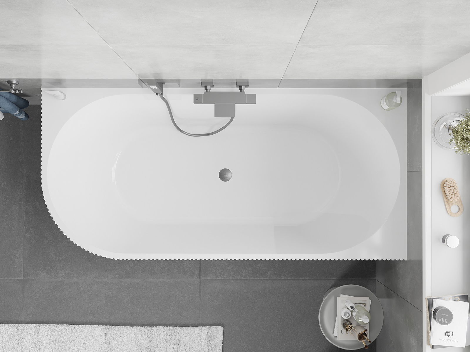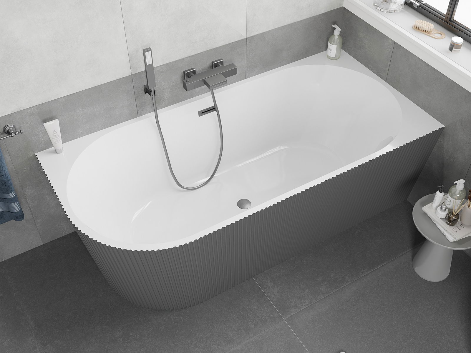 Mexen Silo volně stojící rohová vana pravá rýhovaná 170 x 80 cm, bílá/šedá, přepad gun gray kartáčovaný
