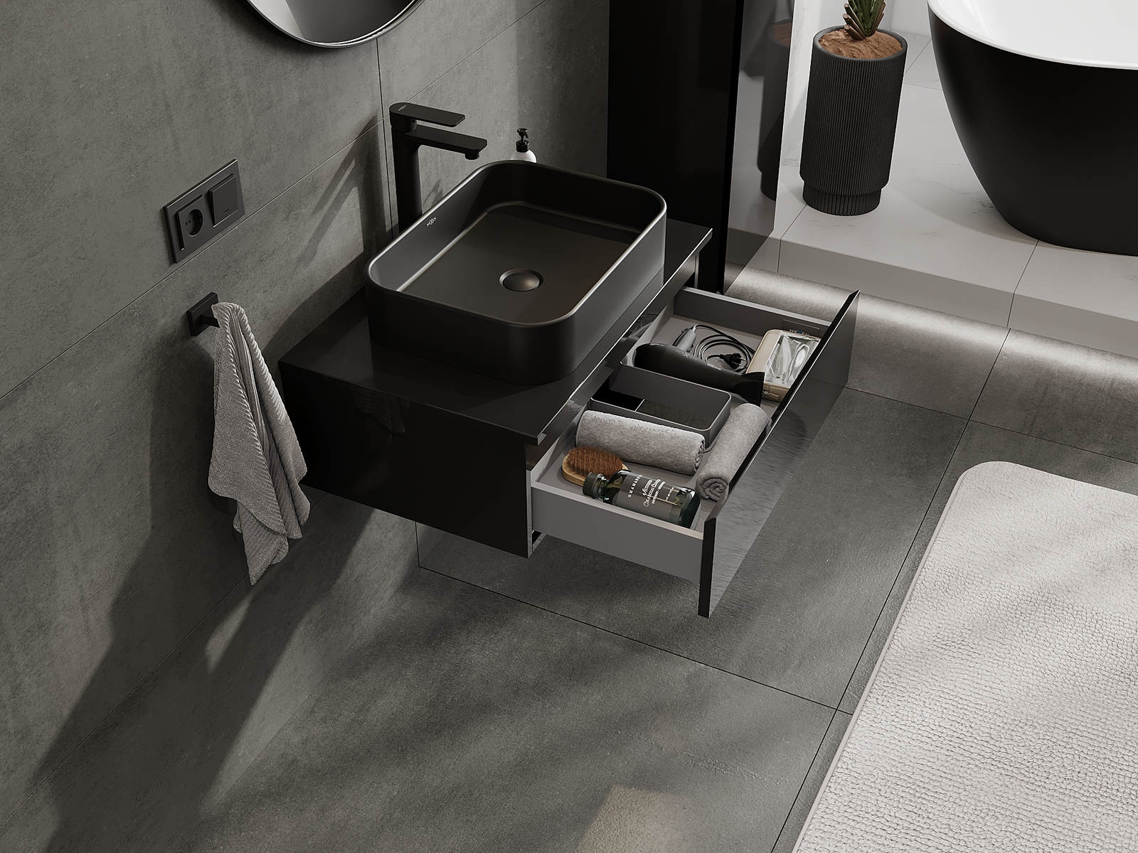 Výřez v zásuvce je navržen tak, aby pojmul sifon, který je nezbytný v instalacích umyvadlových. Díky tomu může být nábytek plně funkčně namontován, aniž by bylo nutné vzdát se prostoru v zásuvce ve prospěch instalace.