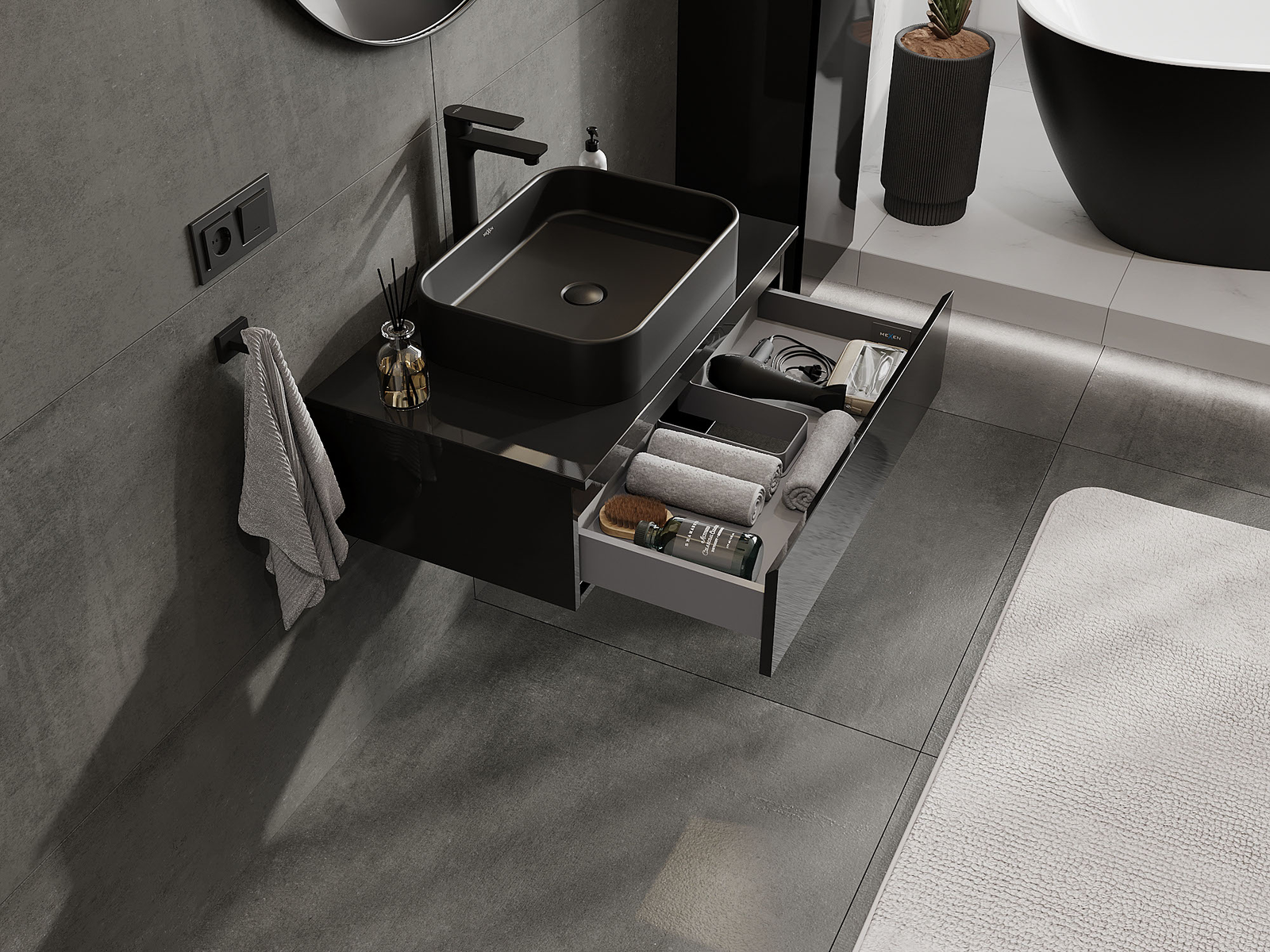 Výřez v zásuvce je navržen tak, aby pojmul sifon, který je nezbytný v instalacích umyvadlových. Díky tomu může být nábytek plně funkčně namontován, aniž by bylo nutné vzdát se prostoru v zásuvce ve prospěch instalace.