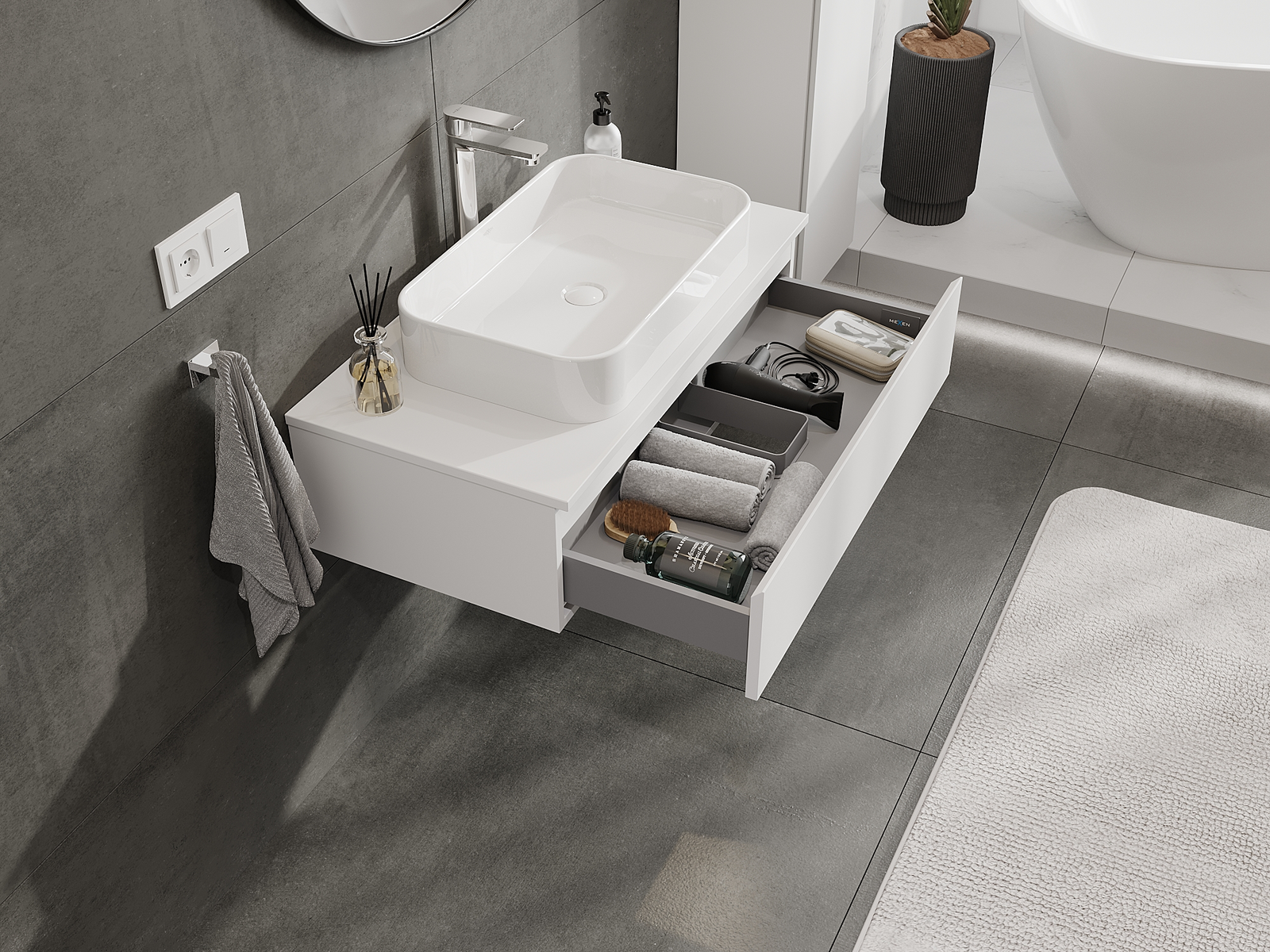 Výřez v zásuvce je navržen tak, aby pojmul sifon, který je nezbytný v instalacích umyvadlových. Díky tomu může být nábytek plně funkčně namontován, aniž by bylo nutné vzdát se prostoru v zásuvce ve prospěch instalace.