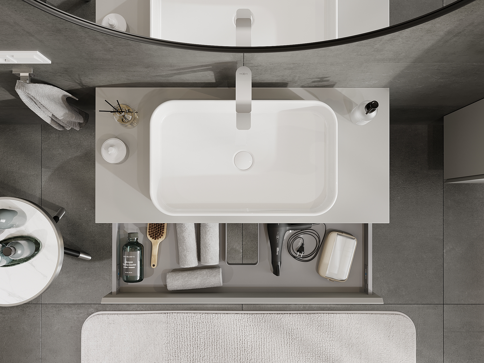 Výřez v zásuvce je navržen tak, aby pojmul sifon, který je nezbytný v instalacích umyvadlových. Díky tomu může být nábytek plně funkčně namontován, aniž by bylo nutné vzdát se prostoru v zásuvce ve prospěch instalace.