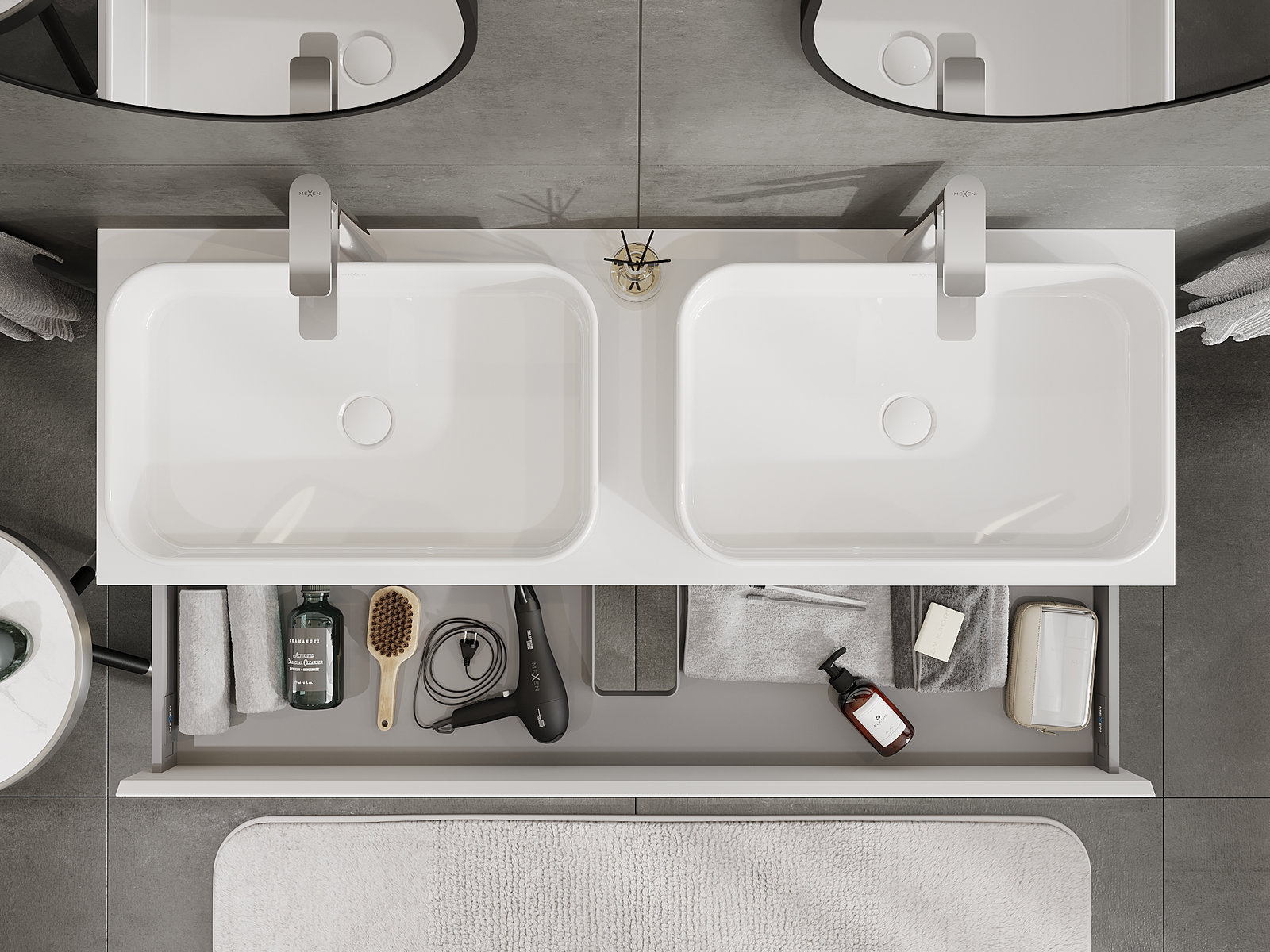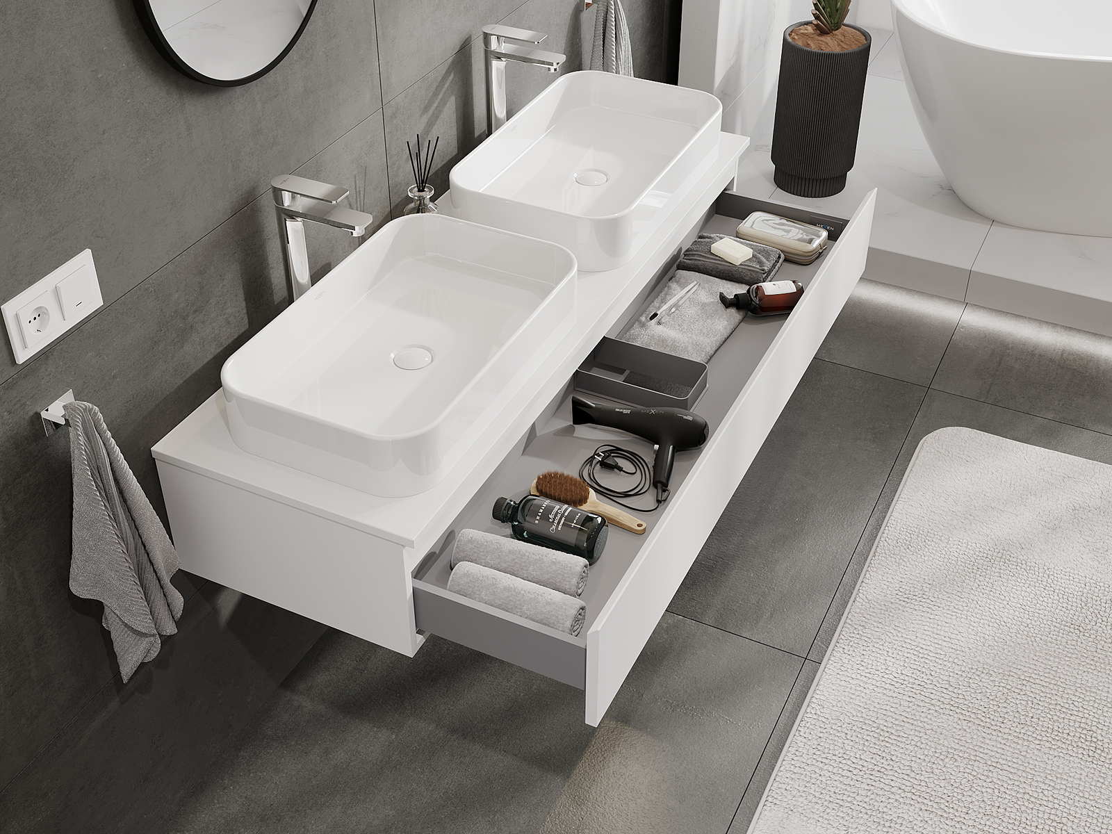 Výřez v zásuvce je navržen tak, aby pojmul sifon, který je nezbytný v instalacích umyvadlových. Díky tomu může být nábytek plně funkčně namontován, aniž by bylo nutné vzdát se prostoru v zásuvce ve prospěch instalace.