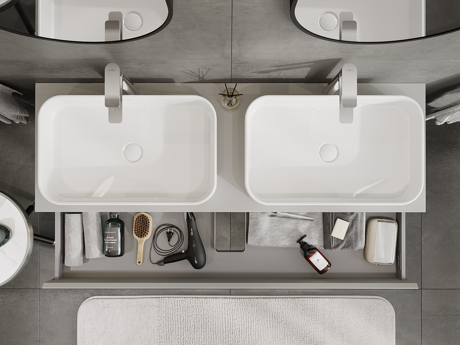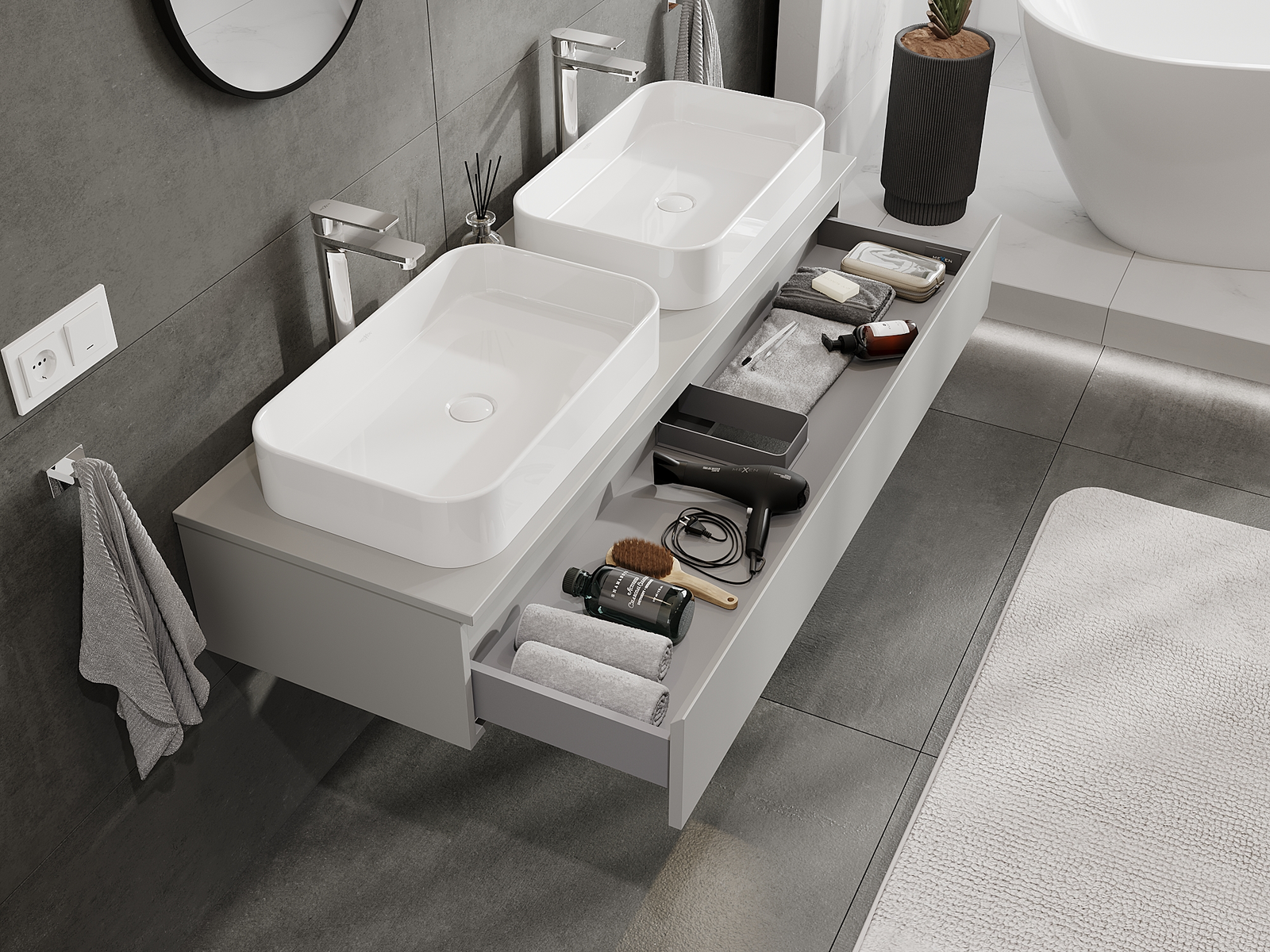 Výřez v zásuvce je navržen tak, aby pojmul sifon, který je nezbytný v instalacích umyvadlových. Díky tomu může být nábytek plně funkčně namontován, aniž by bylo nutné vzdát se prostoru v zásuvce ve prospěch instalace.