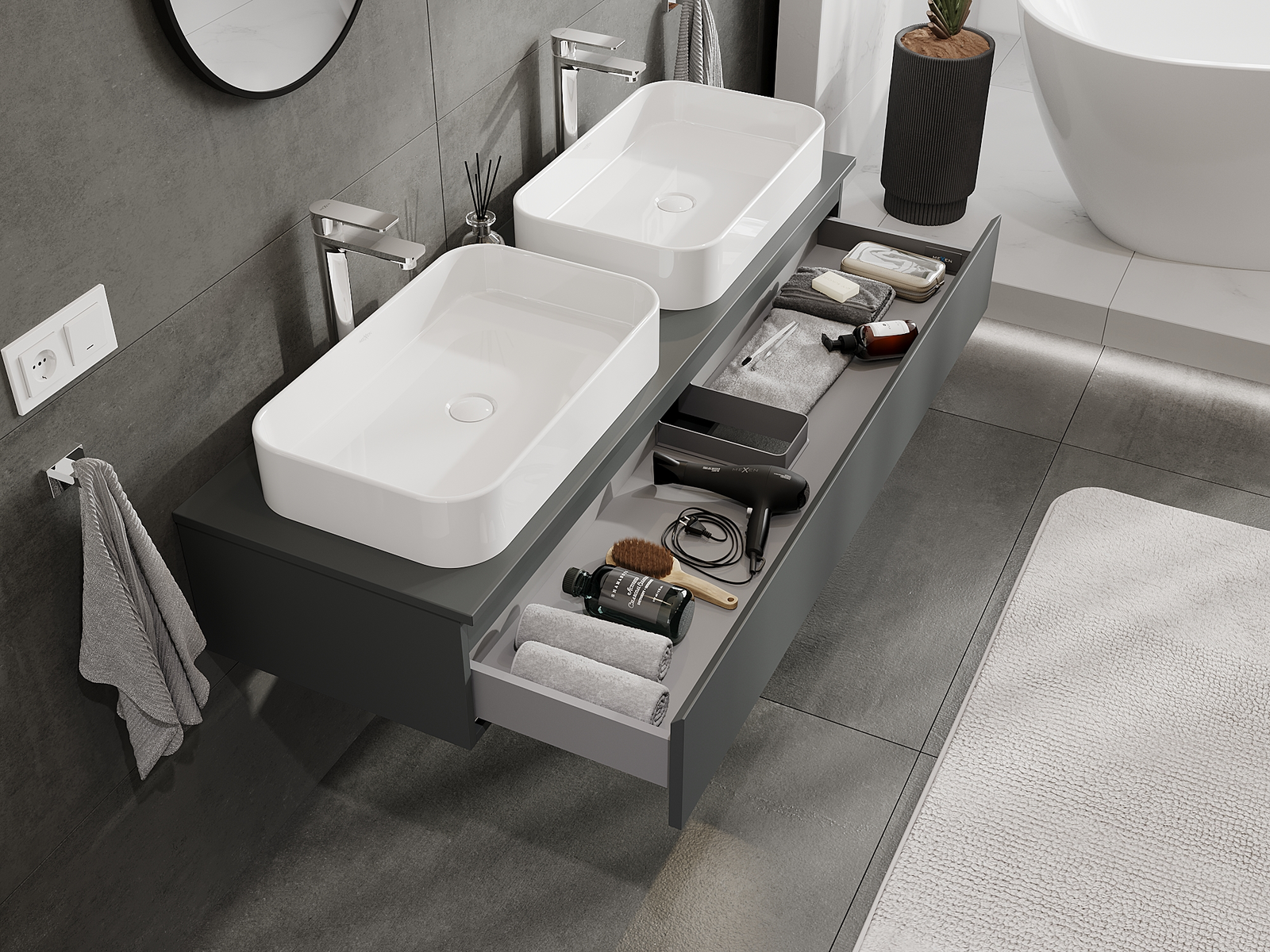 Výřez v zásuvce je navržen tak, aby pojmul sifon, který je nezbytný v instalacích umyvadlových. Díky tomu může být nábytek plně funkčně namontován, aniž by bylo nutné vzdát se prostoru v zásuvce ve prospěch instalace.