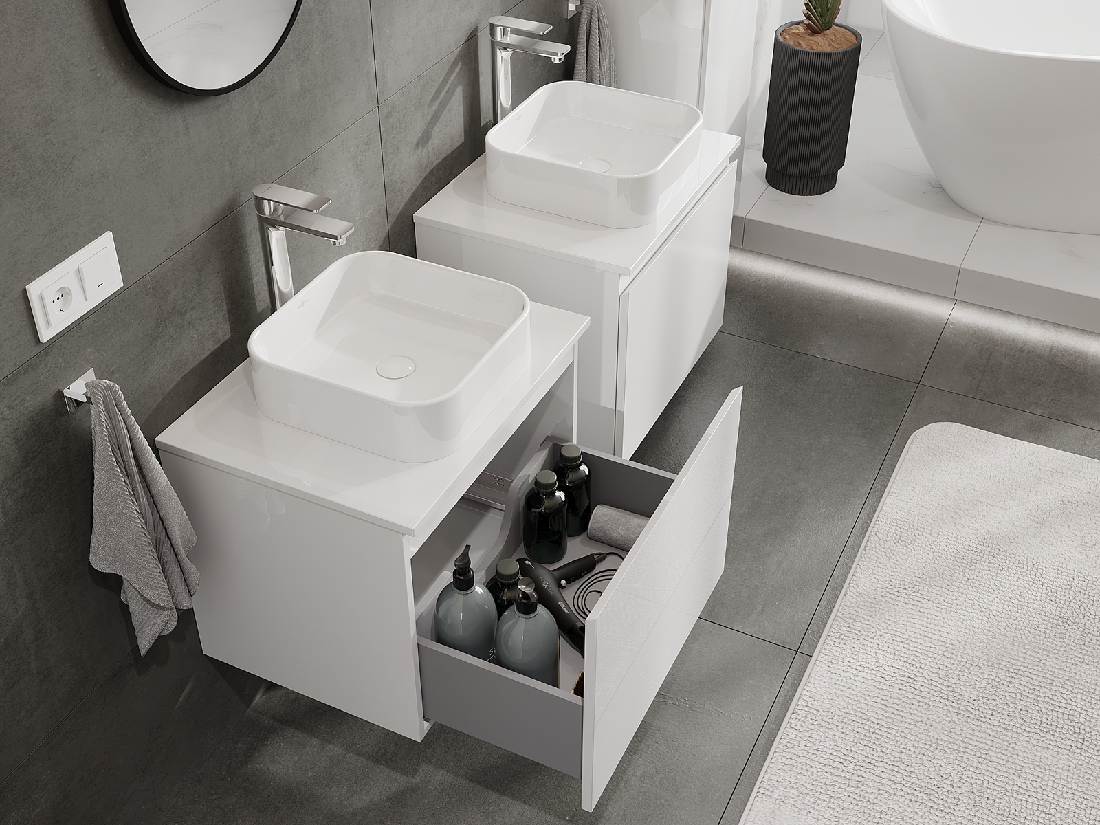 Naše modulární koupelnový nábytek lze kombinovat v různých barevných konfiguracích, což umožňuje plnou personalizaci. Můžete si vybrat jak vzhled, tak funkce jednotlivých prvků, což umožňuje přizpůsobit nábytek vašim stylovým a uživatelským preferencím.