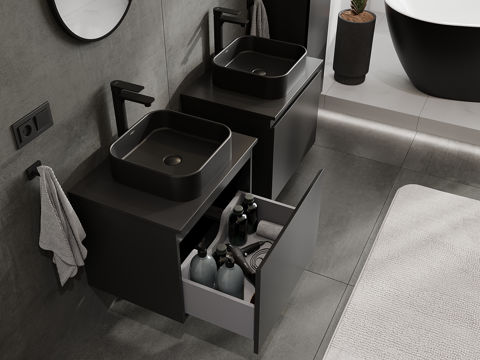 Výřez v zásuvce je navržen tak, aby pojmul sifon, který je nezbytný v instalacích umyvadlových. Díky tomu může být nábytek plně funkčně namontován, aniž by bylo nutné vzdát se prostoru v zásuvce ve prospěch instalace.