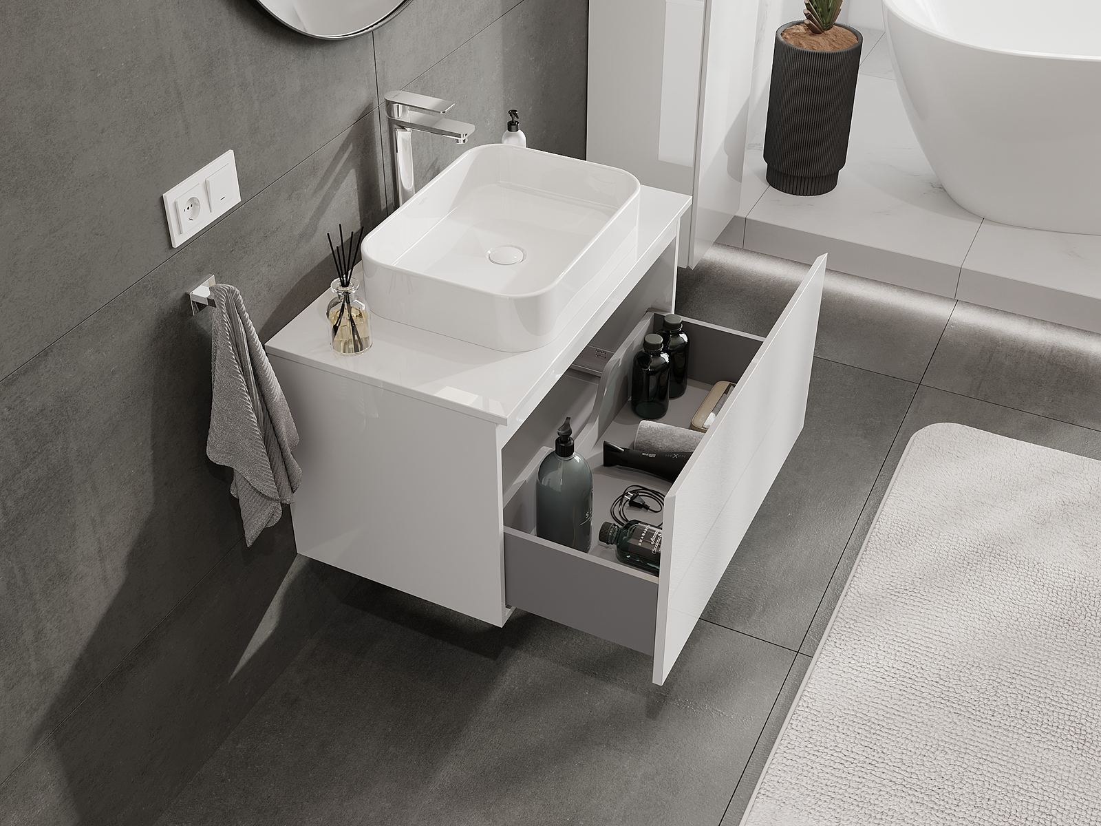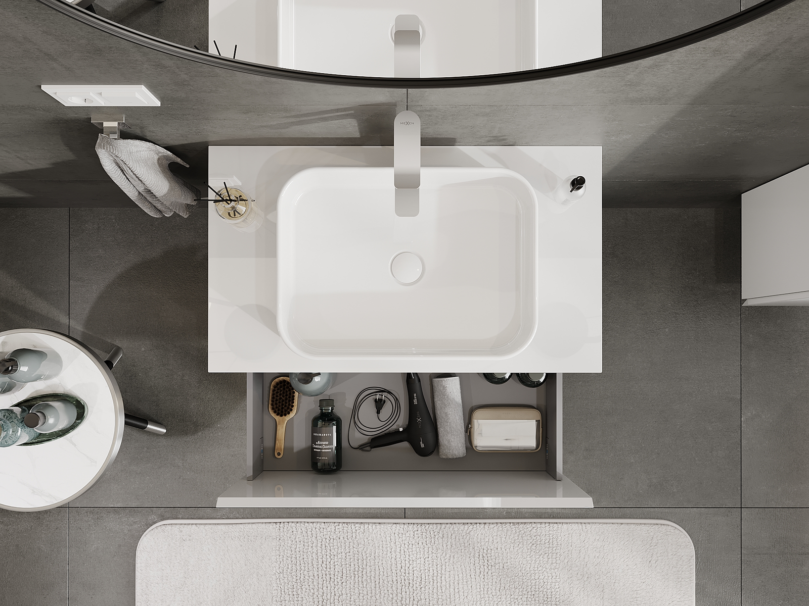 Výřez v zásuvce je navržen tak, aby pojmul sifon, který je nezbytný v instalacích umyvadlových. Díky tomu může být nábytek plně funkčně namontován, aniž by bylo nutné vzdát se prostoru v zásuvce ve prospěch instalace.
